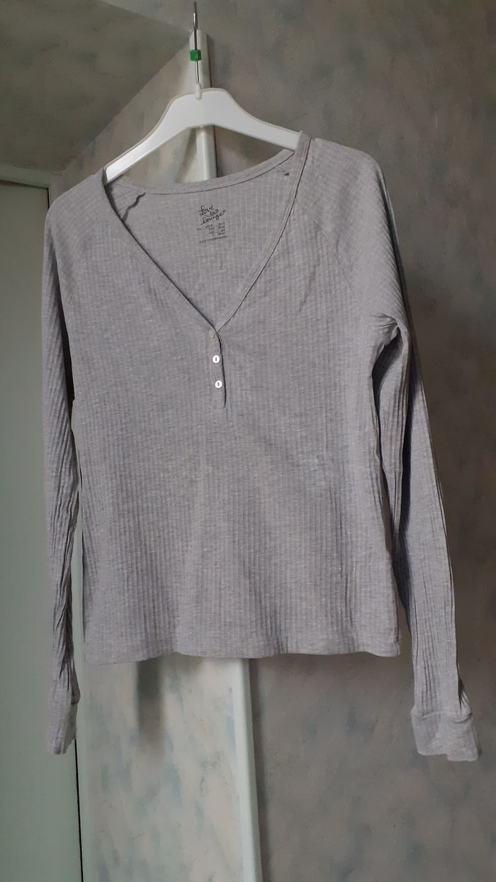 Vends un tee-shirt manches longues en maille côtelée 90 % coton, 5 % viscose, 5 % élasthanne, décolleté en V, couleur gris uni avec petits boutons à l'encolure, marque Love to Lounge, taille 38-40 sur l'étiquette mais plutôt 36-38 d'après les mesures. Longueur de l'épaule à la base : 54 cm Largeur aisselle à aisselle : 41 cm.