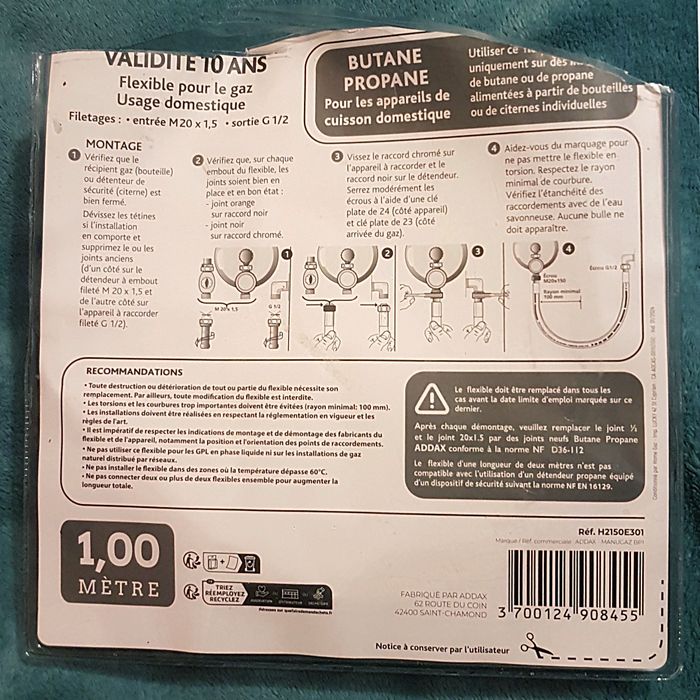 ⚠️ PAS D'ENVOI 🚫 remise à NÎMES ⚠️ Tuyau flexible gaz butane et propane. Pour bouteille de gaz ou de citerne. Tube de 1 mètre en caoutchouc. Renforcé, avec embouts vissables. Usage pour appareil domestique. Mode d'emploi au dos de l'emballage. Jet gaz, Manugaz. NF. Made in France. Accessoire cuisine cuisson gazinière. (Plus d'infos écrit sur la 2ième photo). Erreur d'achat en magasin à 25 €, je voulais un tuyau pour gaz naturel de ville, mais non remboursable car j'ai ouvert l'emballage. 💫 État neuf , jamais utilisé, avec emballage. 🏠 Maison non fumeur, sans animaux, sans enfant. 📦 PAS D'ENVOI 🚫 📍 Remise en main propre à NIMES. 💲 Mes prix sont fixes. Même en lot. ➡️ Voir mes autres accessoires dans mes annonces 😉 #PseudoNimes30