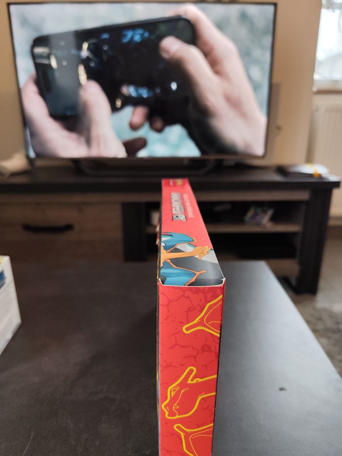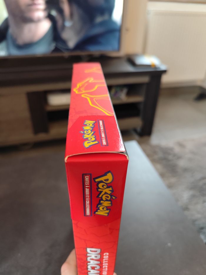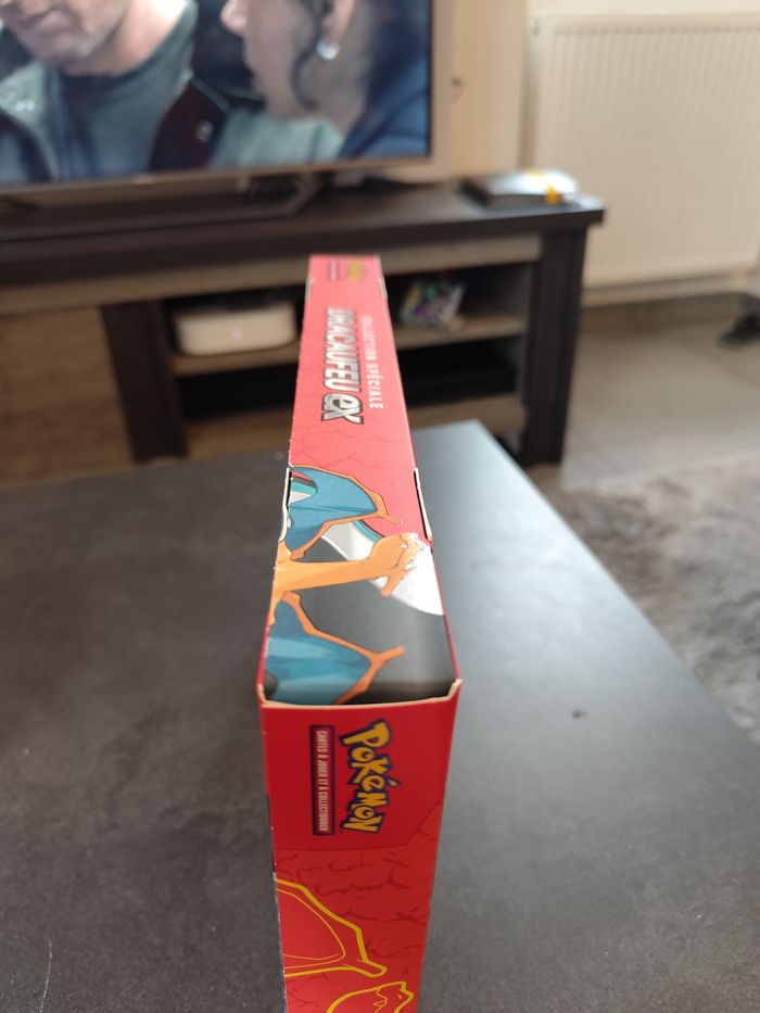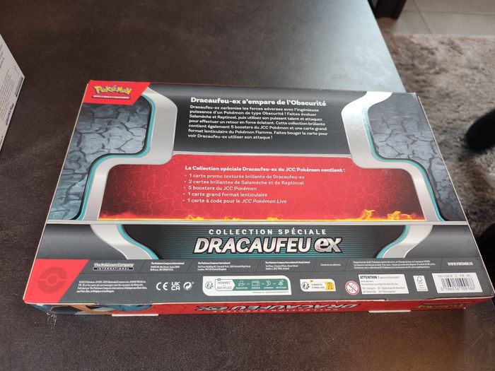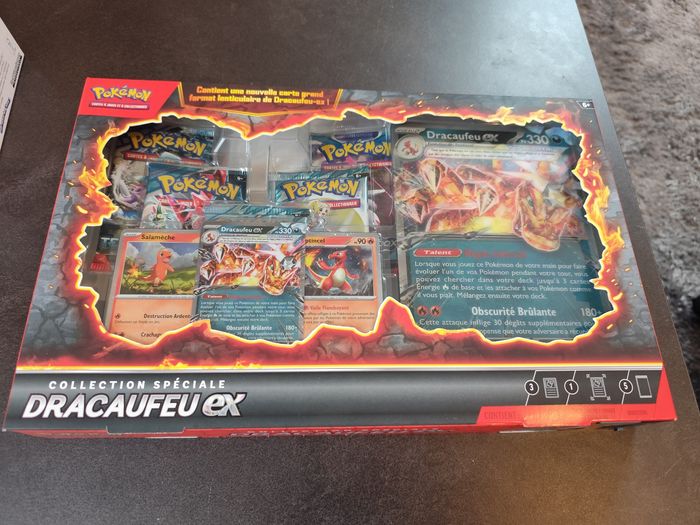Coffret Dracaufeu EX version française, complet.Boîte en bon état général : quelques petites marques d’usure sur le carton, mais vitrine transparente propre et coffret bien rigide. �Conservé à l’abri de l’humidité et de la fumée.Contenu 1 carte promo Dracaufeu EX.2 cartes brillantes Salamèche et Reptincel.1 grande carte Dracaufeu EX.5 boosters de cartes Pokémon + 1 carte code en ligne.