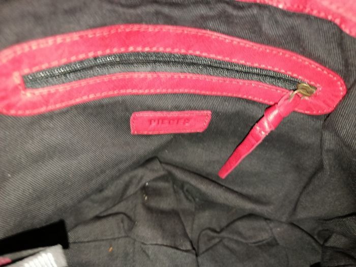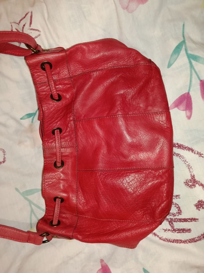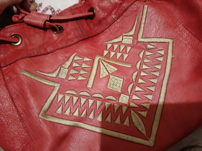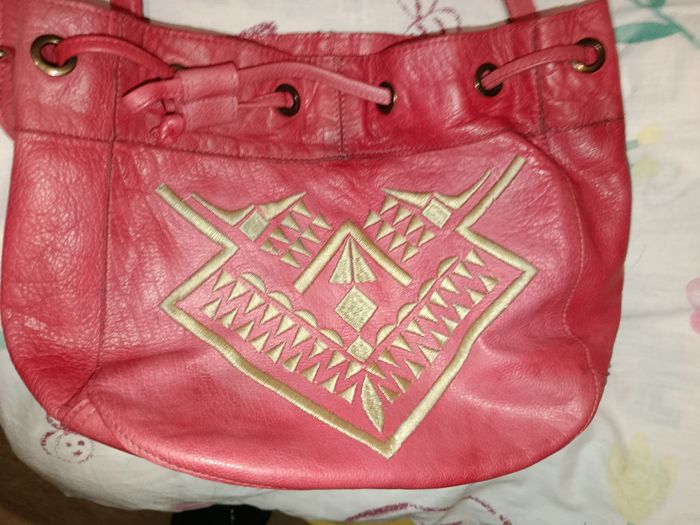 LIRE LA DESCRIPTION ENTIÈRE MERCI. Sac bandoulière rouge et doré avec un beau dessin en doré marque PIECES, il y a pas mal de place dedans, avec 3 poche dans le sac comme vous voyez sur les photos et ce ferme avec un clips comme vous pouvez voir en regardant les photos, merci de regarder les 10 photos svp merci, et un jolie sorte de cordon autour du sac, les lanières sont réglables si vous voulez le sac bas ou haut c'est réglables, il est en parfaite état sauf 3 micro tâche qui se voit a peine il faut y voir de prêt sous le sac alors on y voit pas trop voir photo 7 et 8 j'ai entouré en blanc, sac payer 69€99, je le fait a 23€ pour 23€ je met petit colis pour que vous économisez les frais de port et aussi pour 23€ je fait entre 3 ou 4 cadeaux sa dépend. J'ai plus de photos sauf je peux pas mettre les 20 photos que j'ai je peux en mettre maximum 10 photos