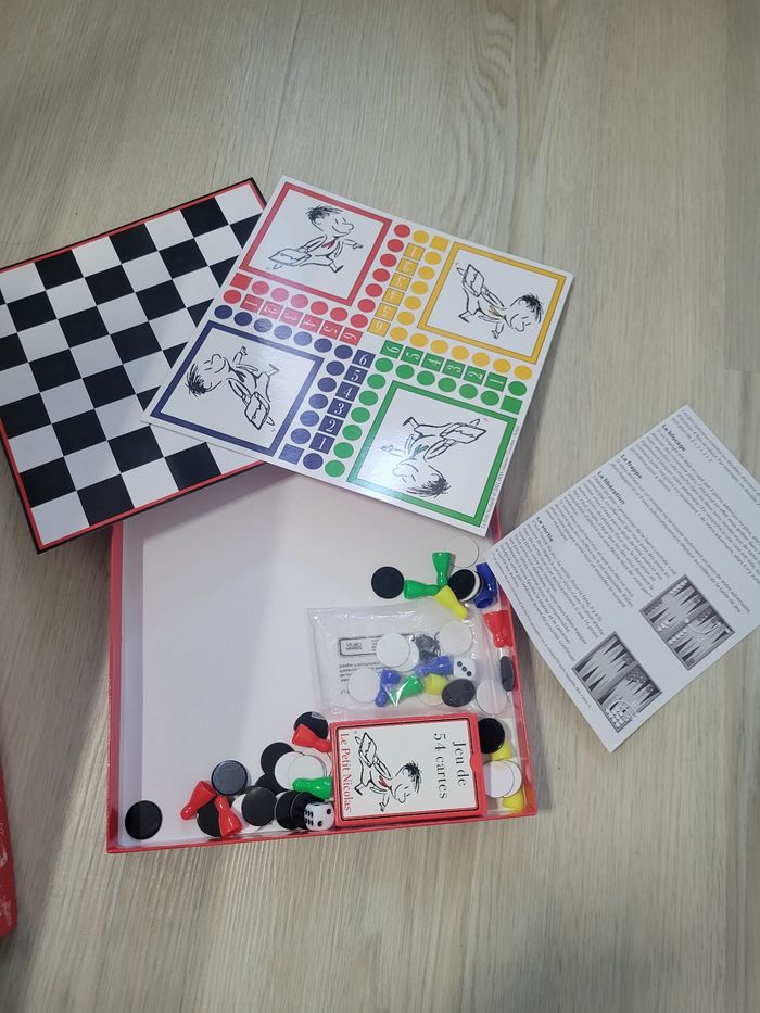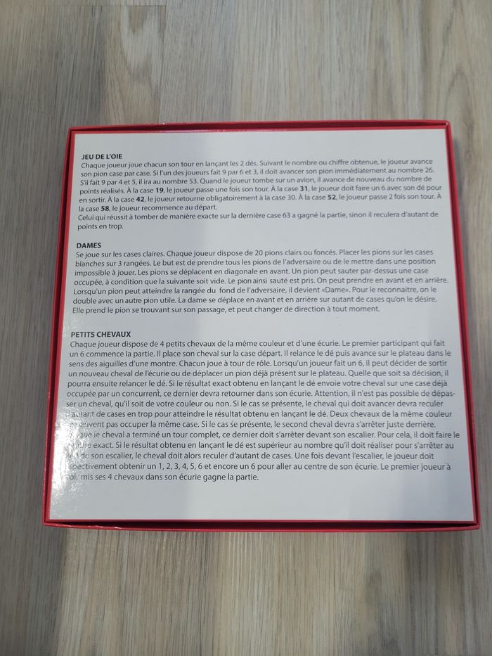 Pour jouer aux dames, au jeu de l'oie, aux petits chevaux et au backgammon. Contient également un jeu de cartes