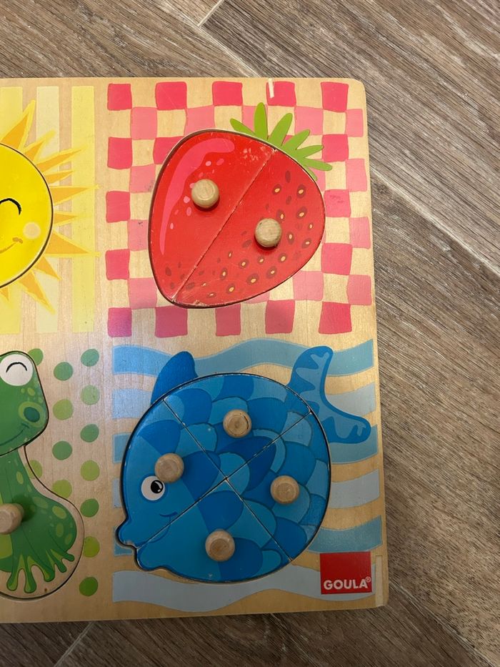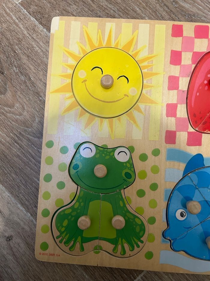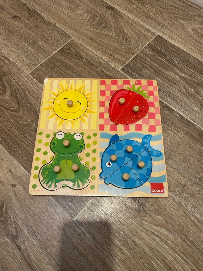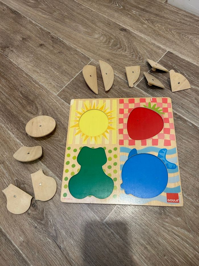 Vends un puzzle en bois ou jouet d’encastrement. Avec 4 niveaux de difficulté, une pièce, deux pièces, trois pièces et 4 pièces. 4 couleurs différentes. Entièrement en bois. Marque Goula. État satisfaisant car le plateau a des défauts des petits bouts de bois manquant montré en photo.