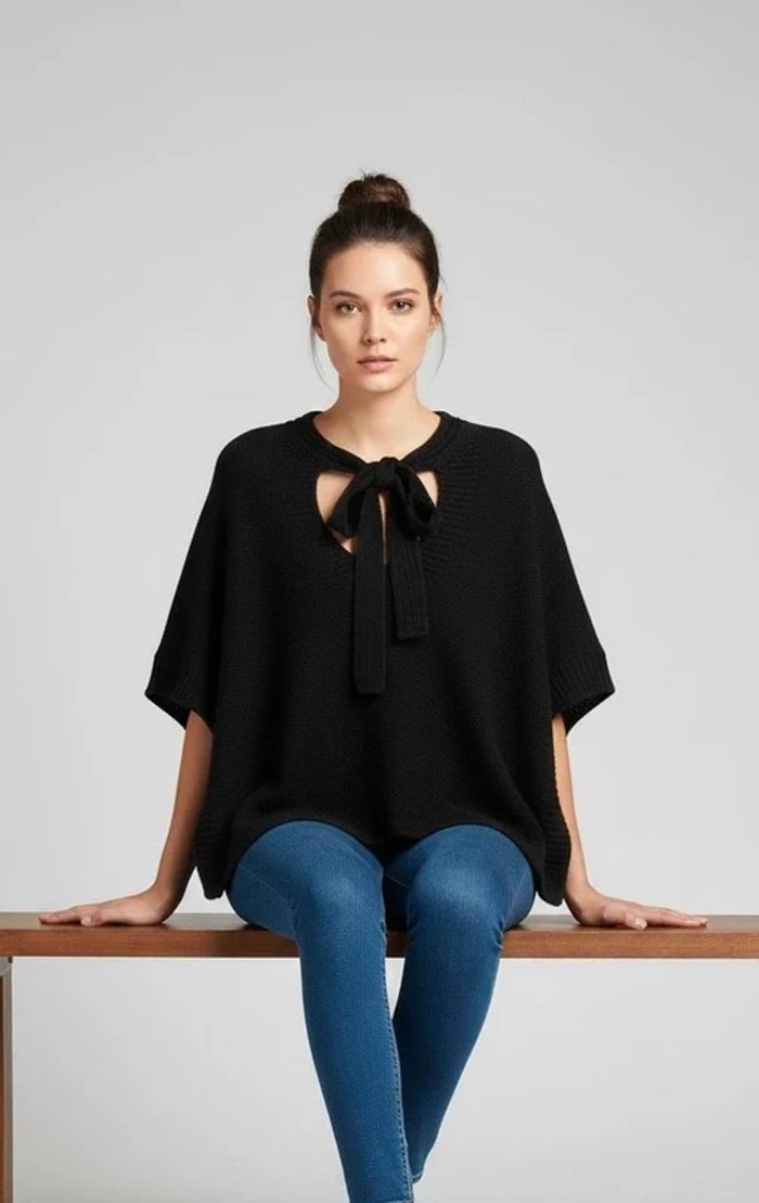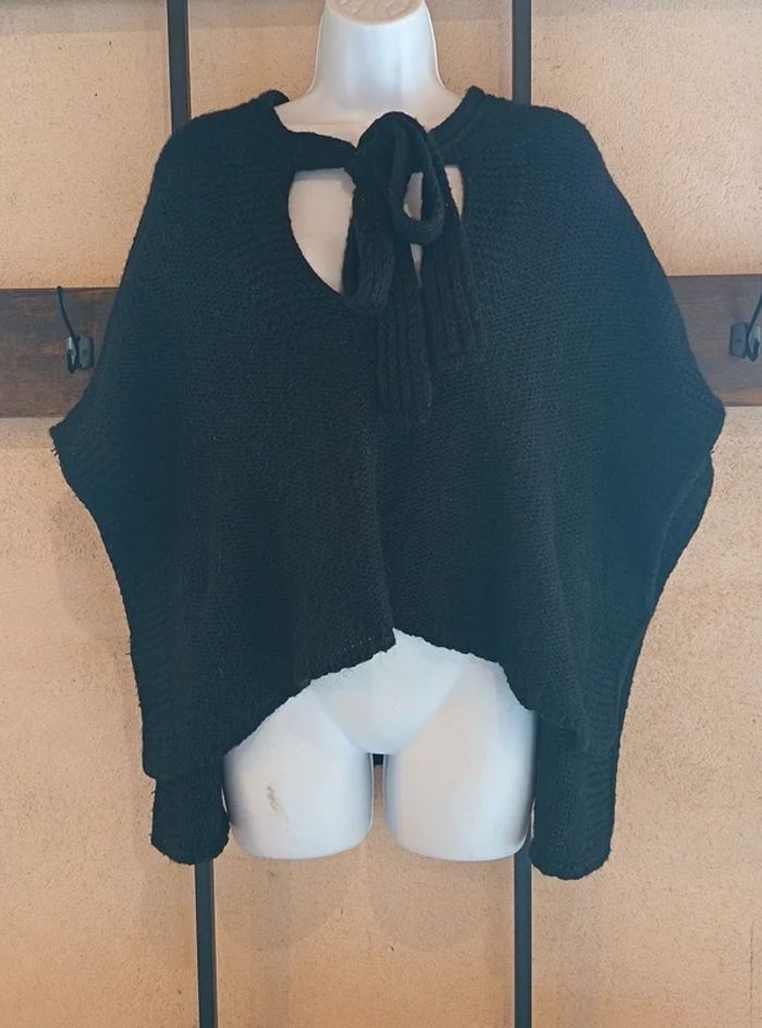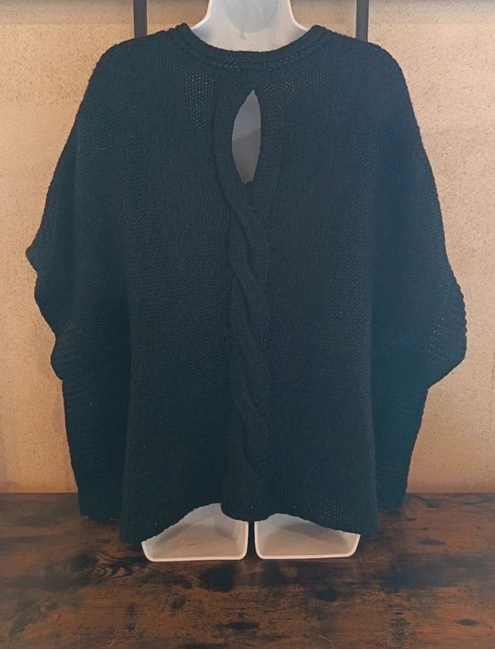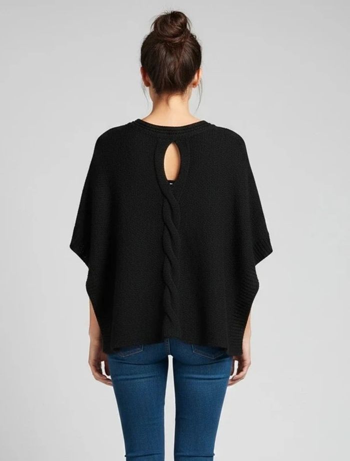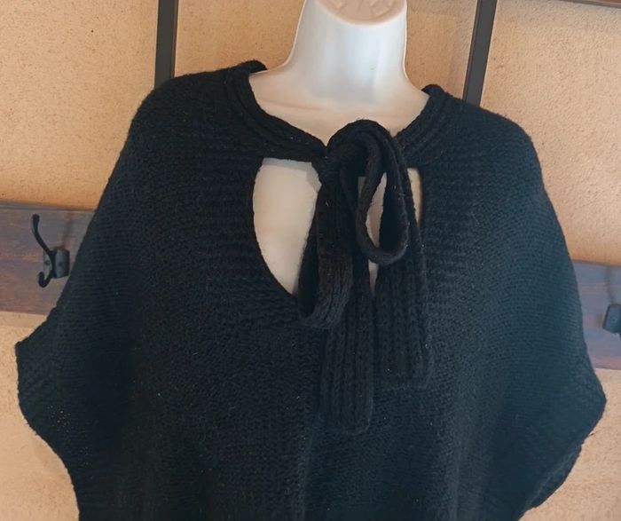 Très jolie cape poncho noire de la marque Grain de Malice, en taille S. On adore son détail de torsade travaillée dans le dos, sa petite ouverture goutte d'eau et sa maille légèrement pailletée qui apporte un éclat discret et élégant.