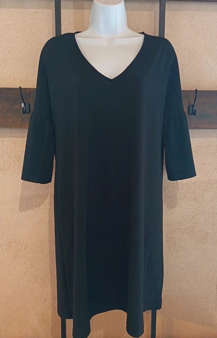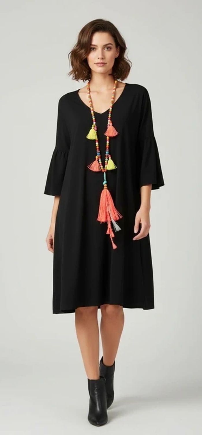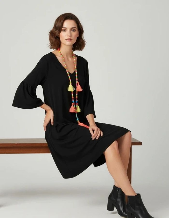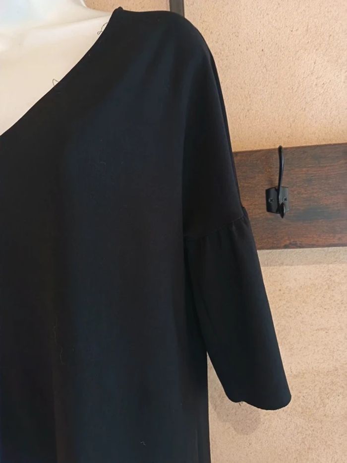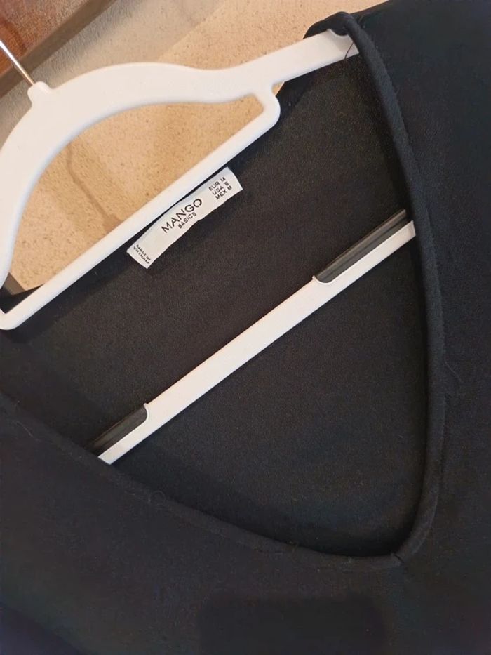 Sublime robe noire fluide de la marque Mango, Sa coupe est très agréable à porter et ses manches évasées apportent une touche bohème chic irrésistible. Parfaite pour toutes les occasions !