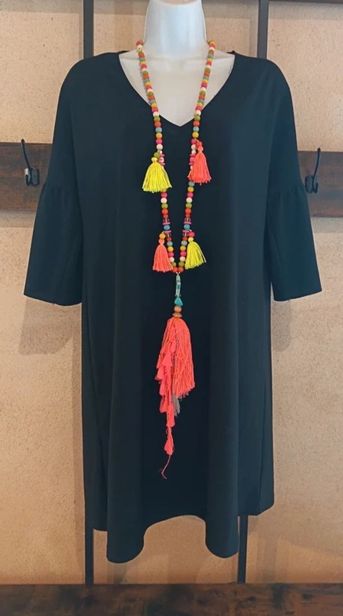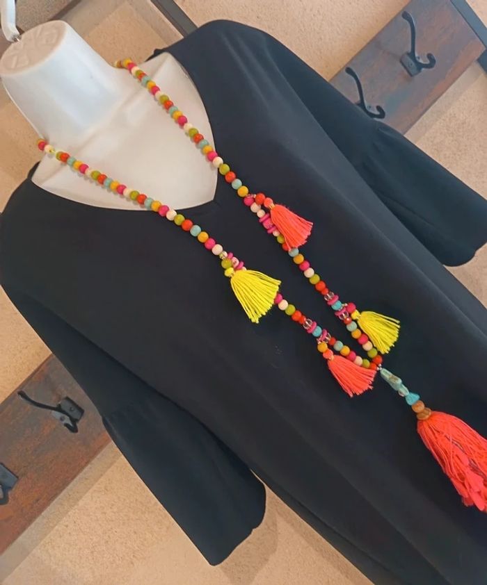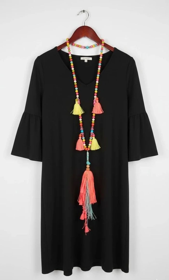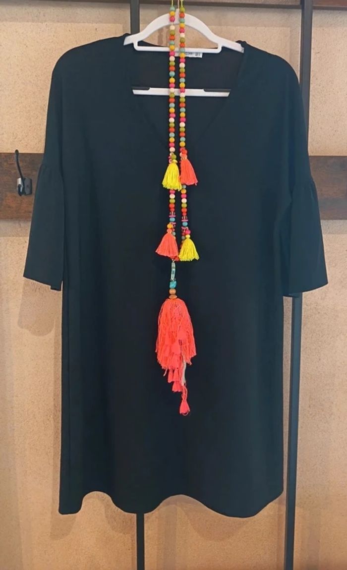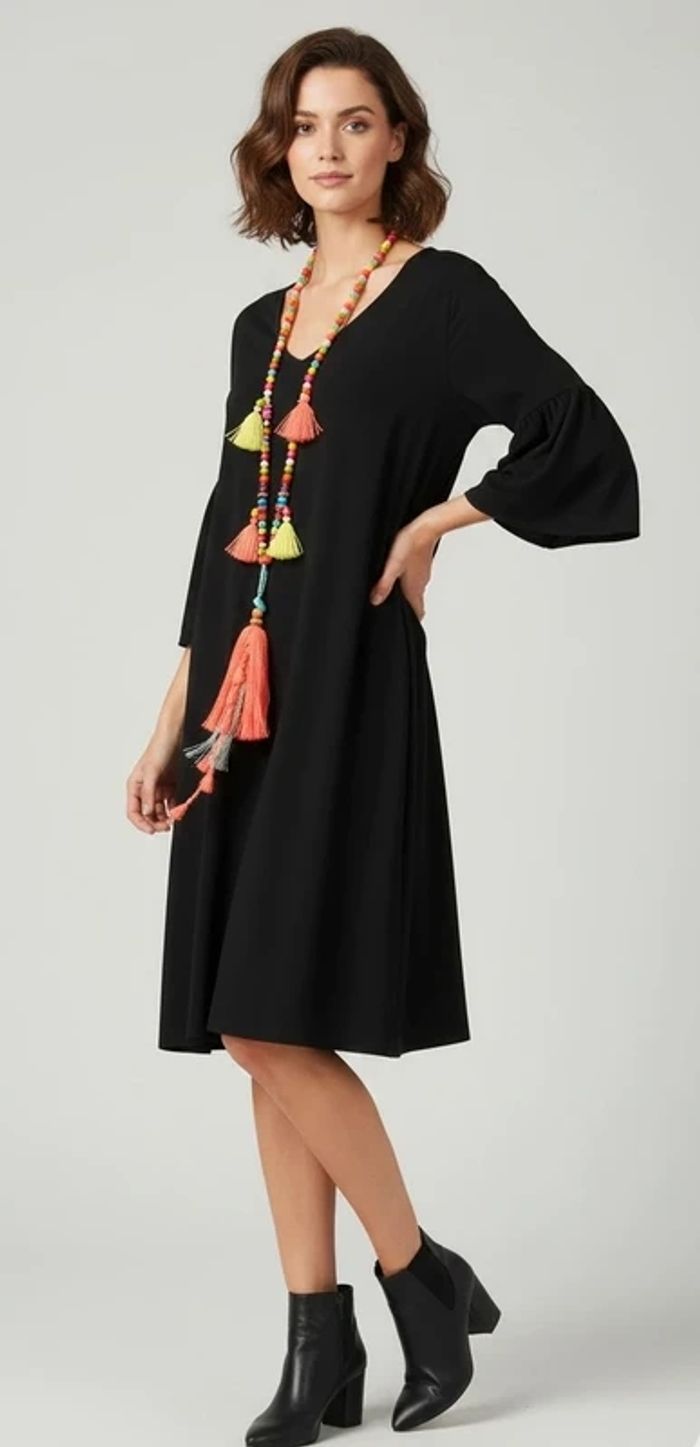 Sublime robe noire fluide de la marque Mango, Sa coupe est très agréable à porter et ses manches évasées apportent une touche bohème chic irrésistible. Parfaite pour toutes les occasions !