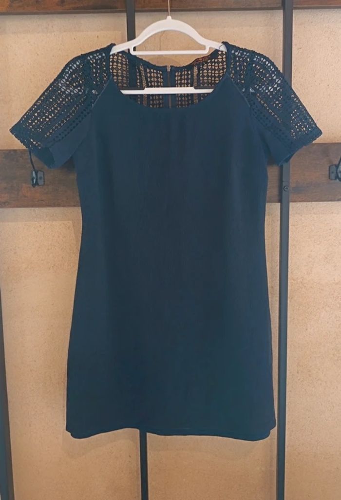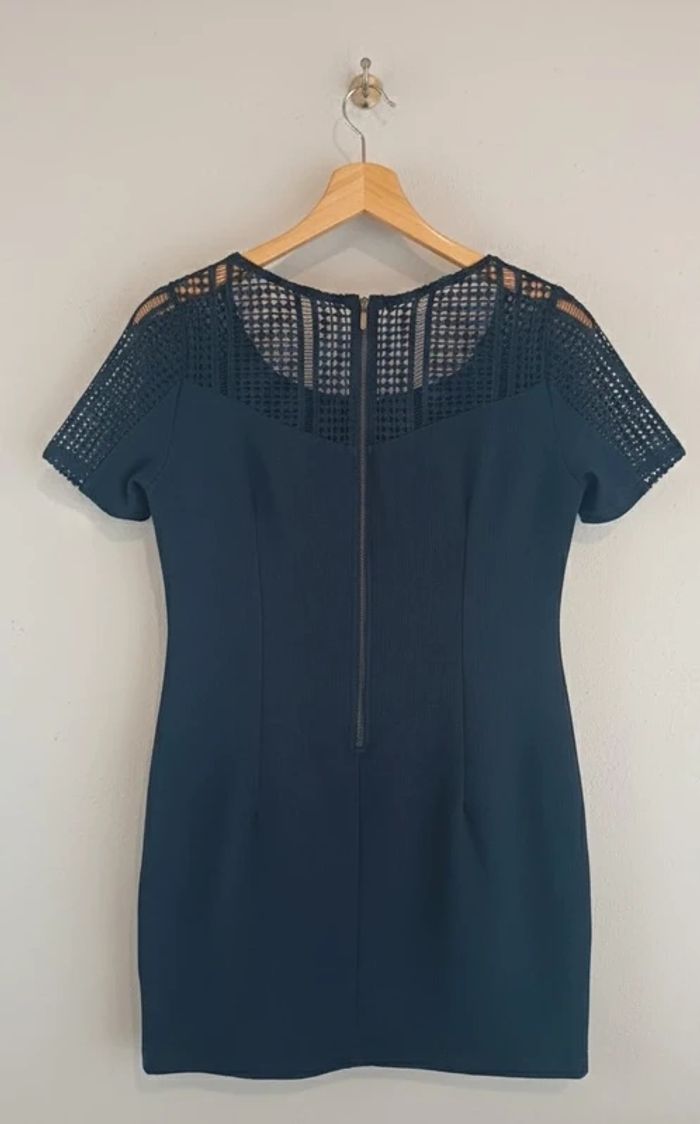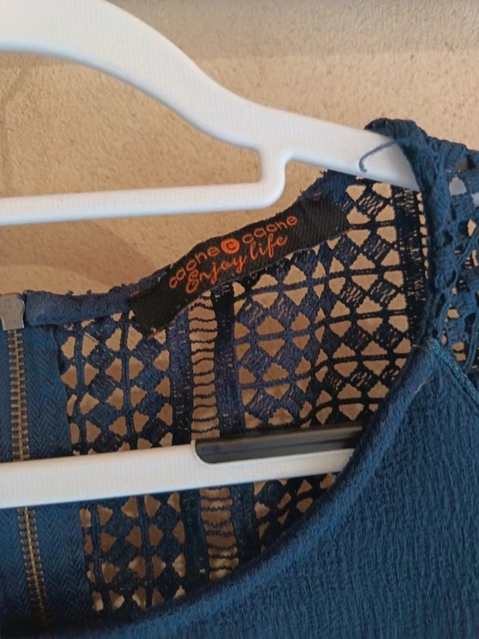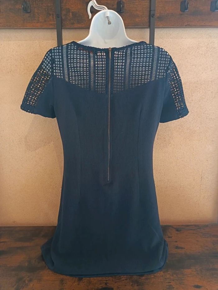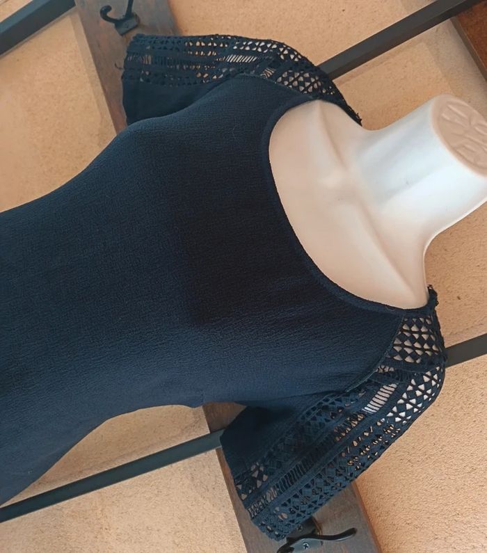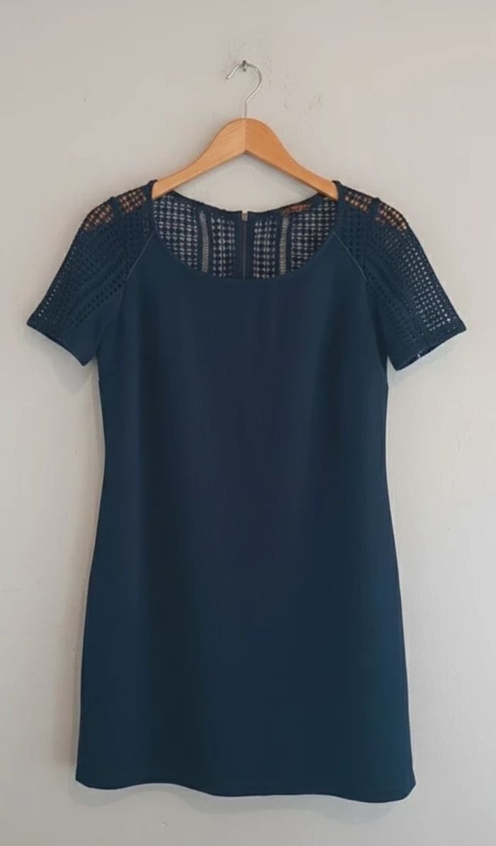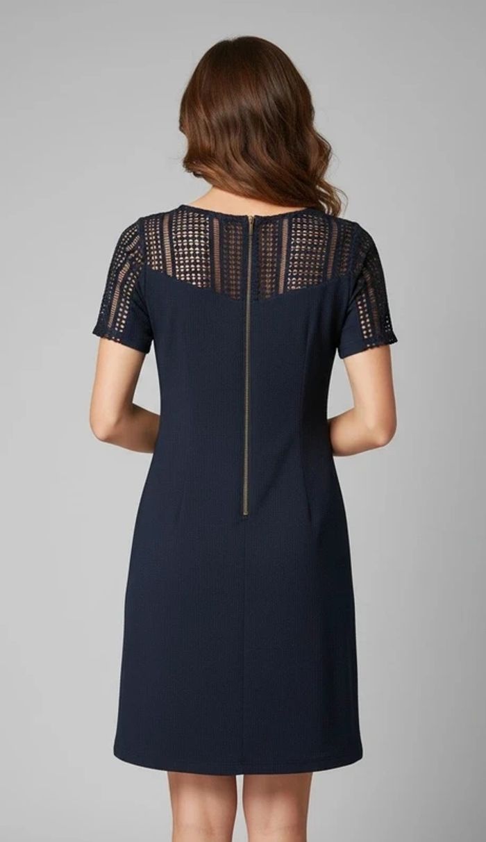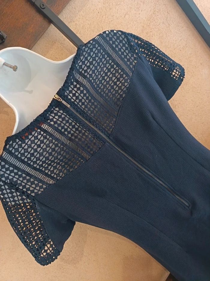 Sublime robe Cache Cache de couleur bleu marine foncé avec de jolis détails en dentelle ajourée sur les épaules et les manches.
