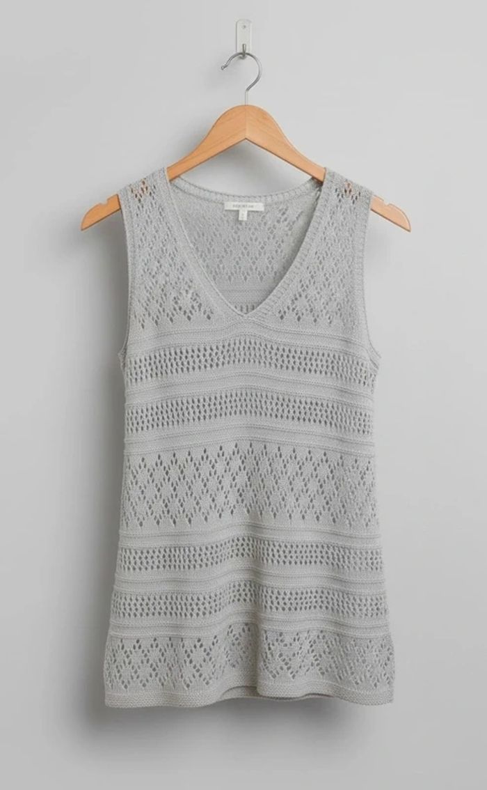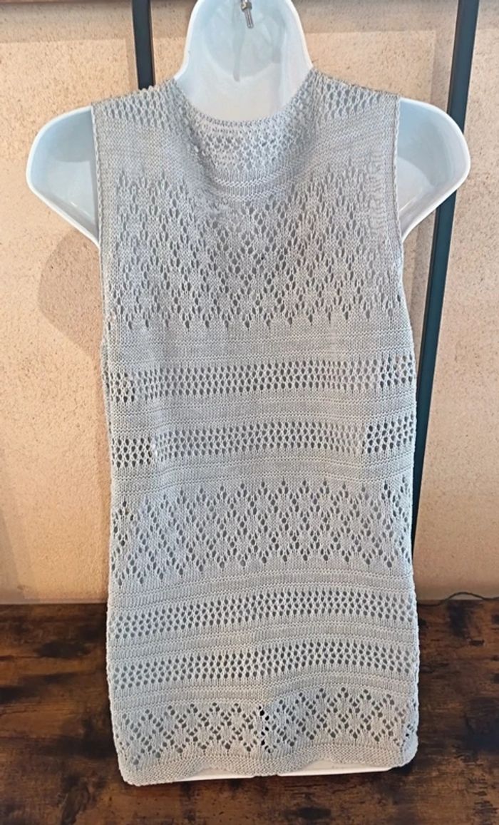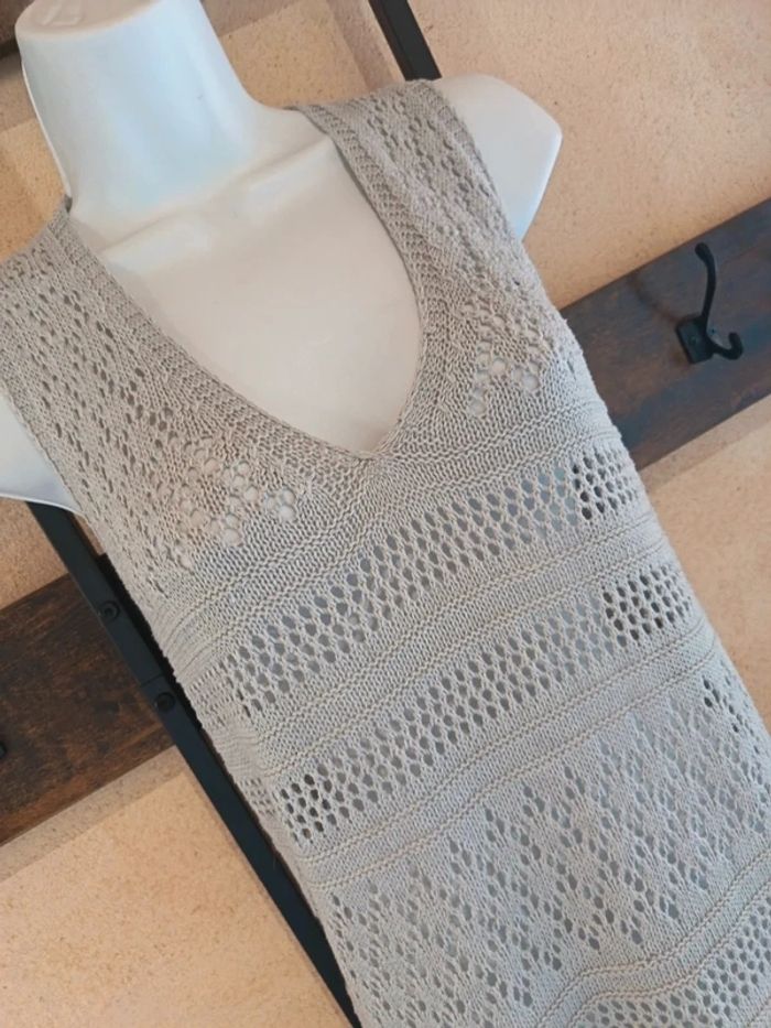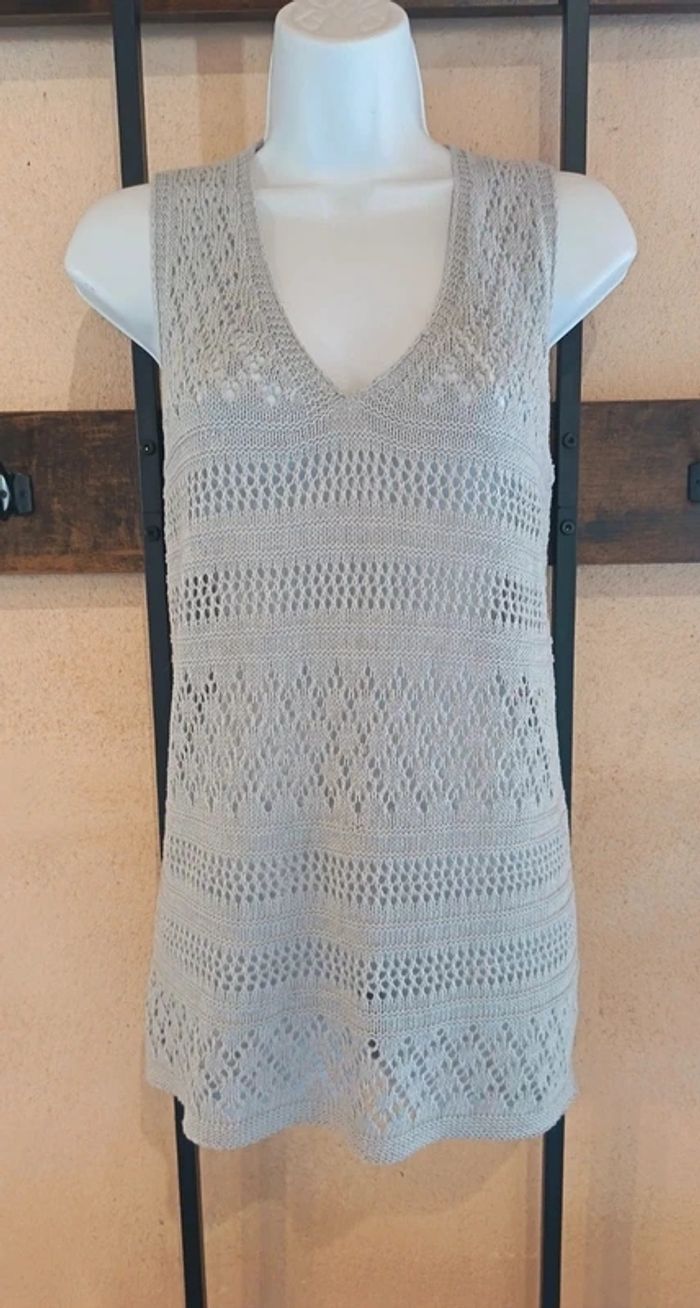 Vend très belle tunique sans manches en maille gris chiné clair.