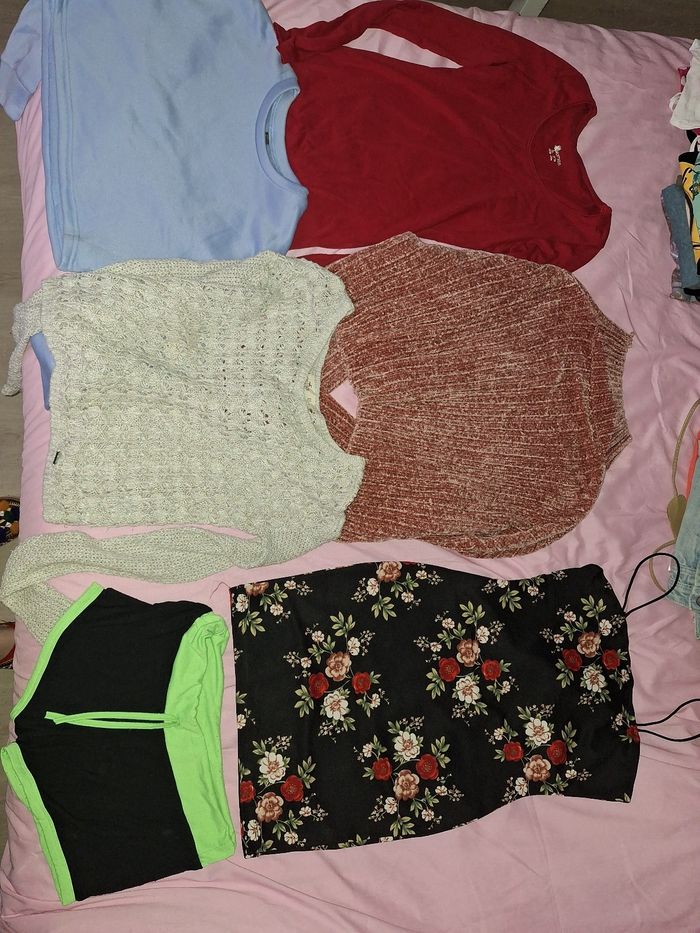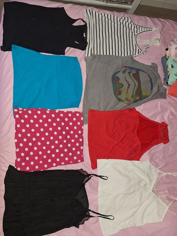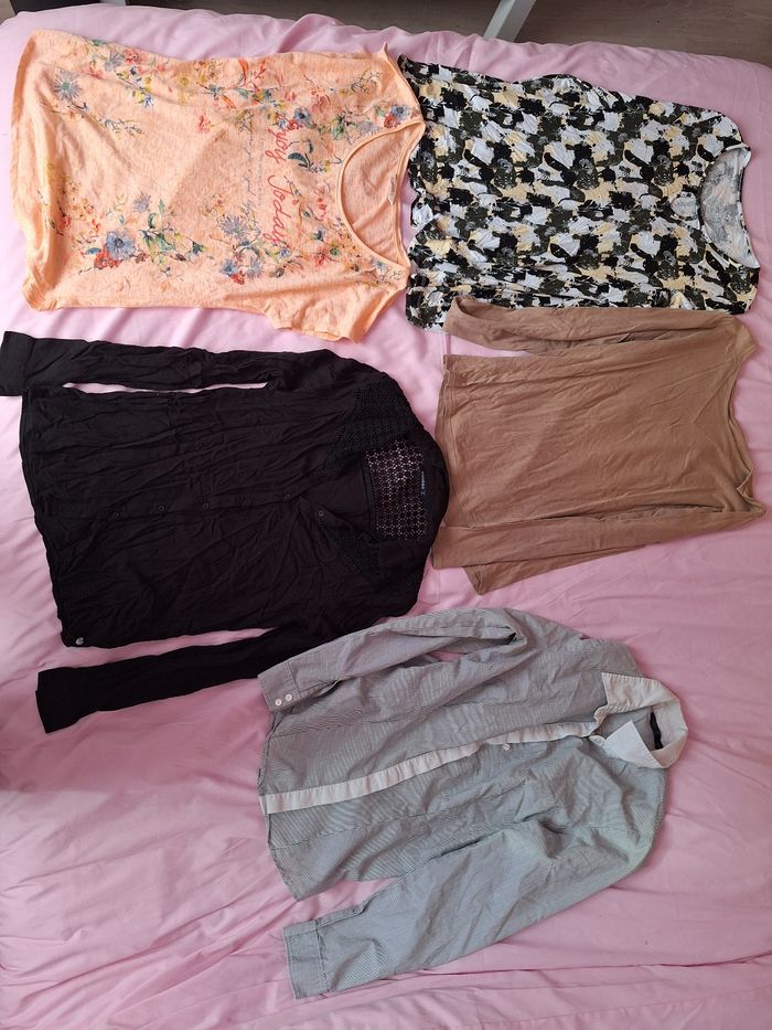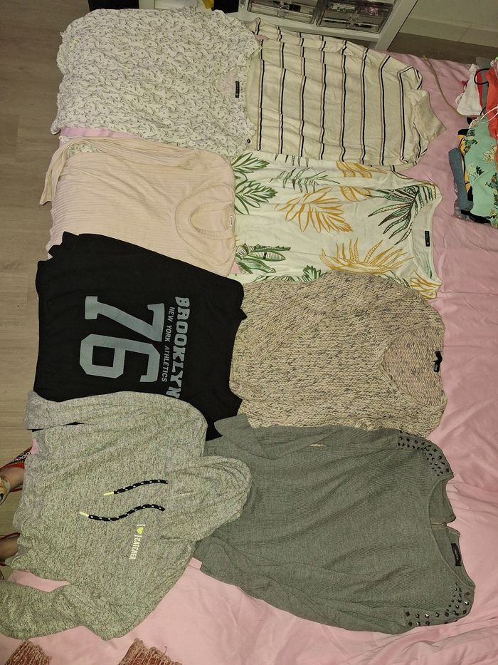 ☆ Lot 52 vêtements femme taille xs/s - 21 hauts - 14 pulls - 2 chemises - 3 pantalon ( 1 jean, 1 pantalon cargo, 1 pantalon tailleur) - 3 combi-short - 3 robes - 3 pantalons léger style pyjamas - 1 combinaison - 2 short ✩ Plusieurs marques zara pull&bear pimkie etc ● Possibilité d'acheter à l'unité dans le lot ♤ Envois rapide et soigné ♤ D'autres articles de cette taille et à petit prix n'hésitez pas à faire un lot :)
