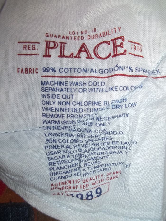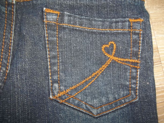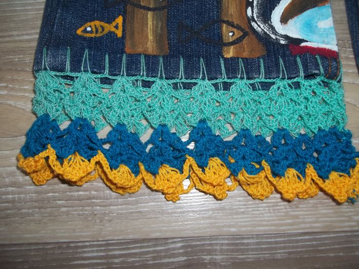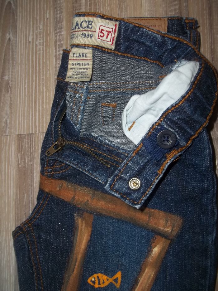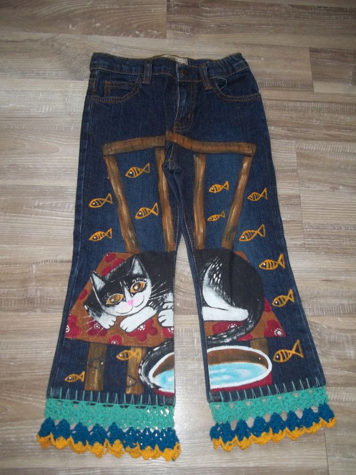 Jean 5 poches coupe bootcut (noté flare) bleu foncé effet scintillant (99 % coton 1 % spandex). Dessin de chat s'étendant sur tout le devant des deux jambes et macramé (turquoise, bleu canard et jaune orangé) sur le bas des jambes. Taille ajustable, 5 passants. Quasiment neuf. Entrejambe 35 cm (+ env 5 cm de crochet), largeur taille 26 cm, bas jambe 16/17 cm.