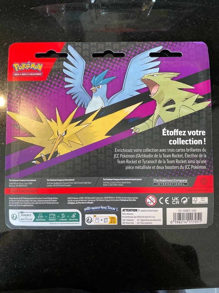 Neuf sous blister duo pack de 2 boosters de carte pokemon plus carte promo et jeton Un contenu complet pour les fans de la Team Rocket Avec le Pokémon – Duopack – Team Rocket – Artikodin/Electhor/Tyranocif – en français, tu obtiens un coffret riche et varié : 3 cartes holographiques cosmo exclusives : Artikodin (DRI 051), Electhor (DRI 070) et Tyranocif (DRI 096), toutes aux couleurs de la Team Rocket. 2 boosters Pokémon du bloc Écarlate et Violet (1x EV06 – Mascarade Crépusculaire et 1x EV03 – Flammes Obsidiennes, contenu à confirmer). 1 pièce argentée collector à l’effigie d’Electhor, parfaite pour compléter ta collection d’accessoires Pokémon.