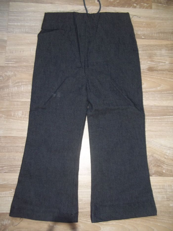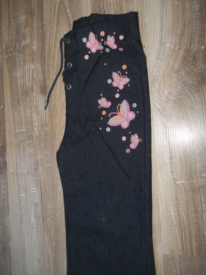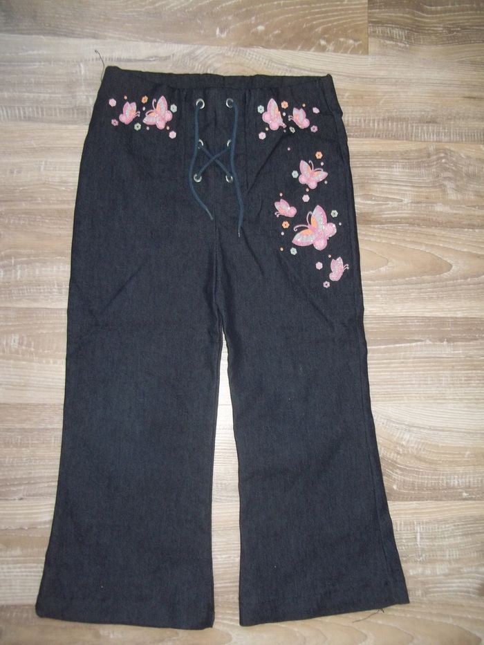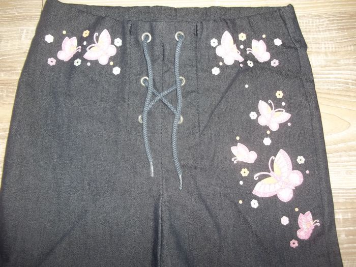 Pantalon en toile souple (73 % coton 25 % polyester 2 % élasthanne) aspect jean foncé, sans ouverture (lacet simplement décoratif), jambes un peu évasées, sérigraphie scintillante papillons roses et orangés sur le devant. Sans poche. Quasiment neuf. Entrejambe 33 cm, hauteur totale sur côté 56 cm, largeur taille 26 cm, bas jambes 17 cm.