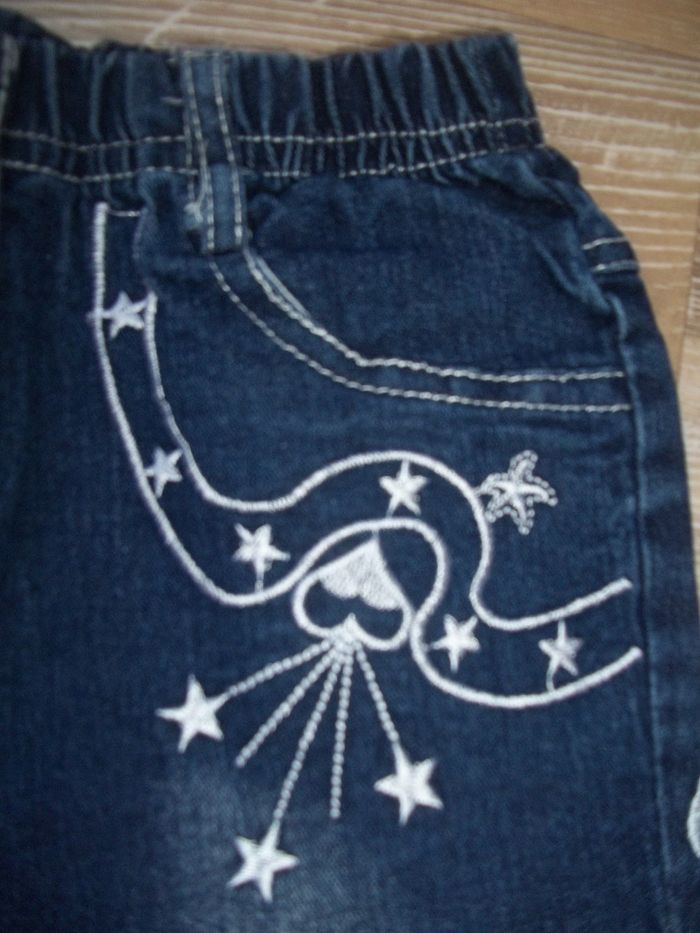Jean sans ouverture large, élastiqué taille (+4 passants), bleu foncé en partie délavé avec effet "froissé", 95 % coton 5 % polyester. 2 poches, 2 derrière. Entrejambe 38 cm, hauteur totale sur côté 58 cm, largeur min taille 22 cm, bas jambes 12 cm.