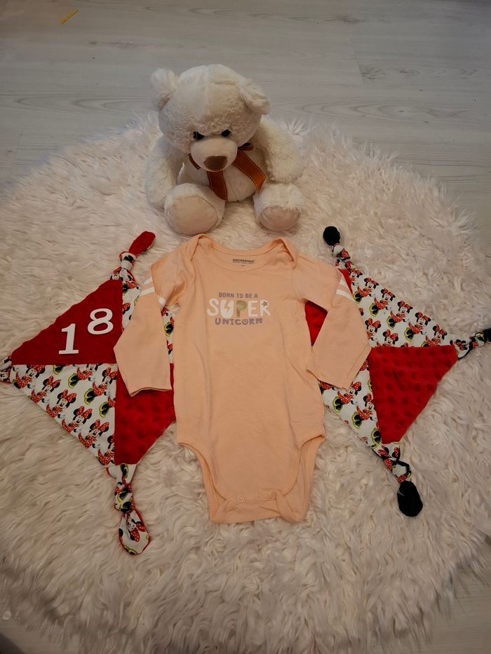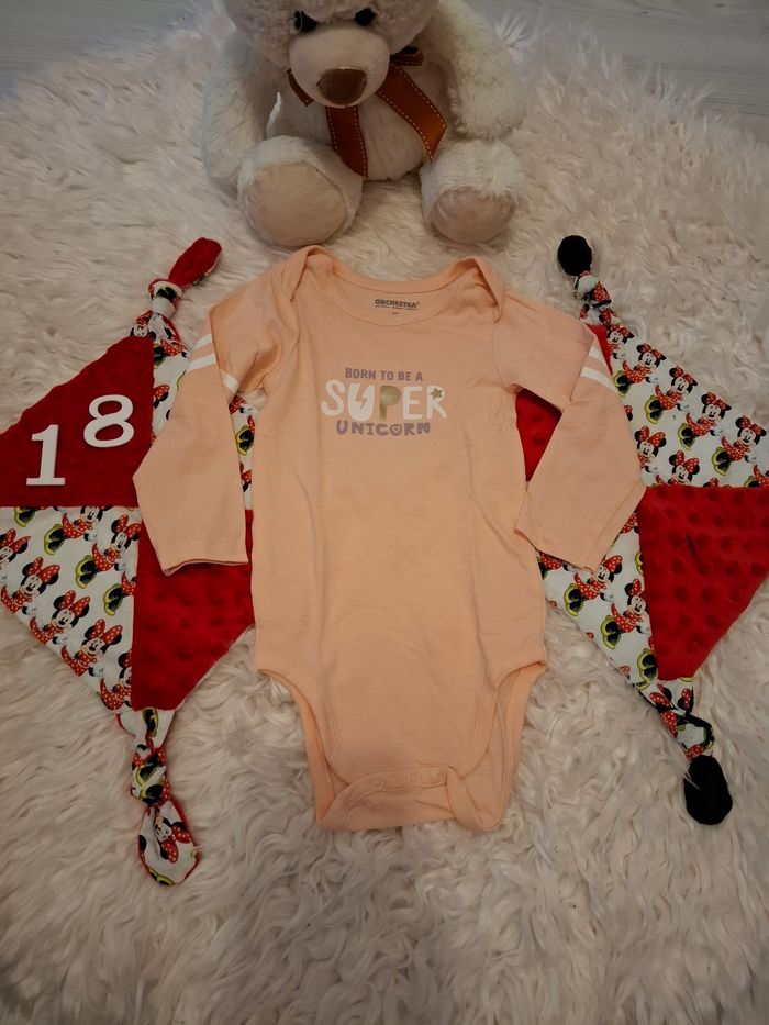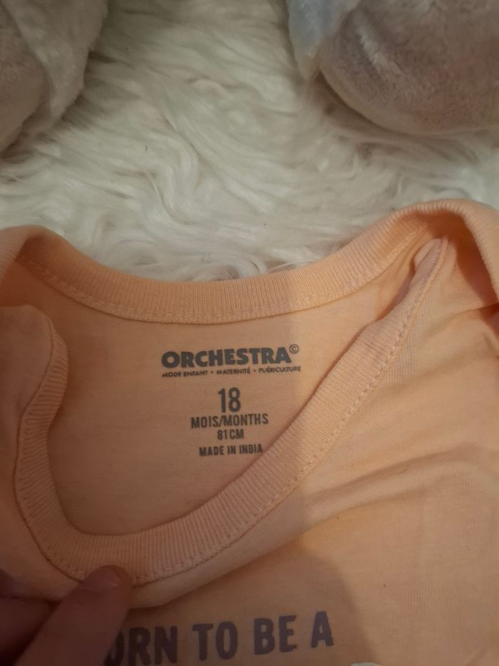 Un bodie a manche longue avec son petit motif Couleur pêche Taille 18 mois Marque Orchestra Très bon état