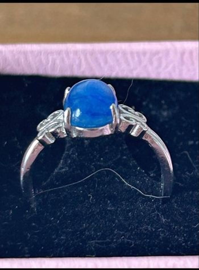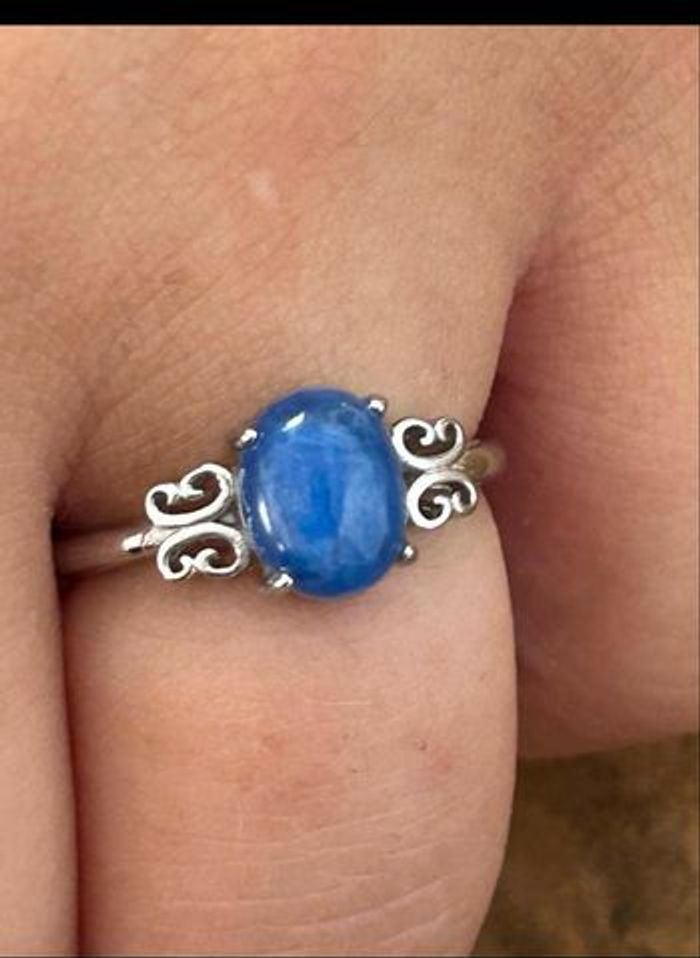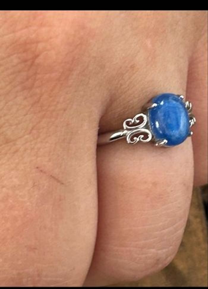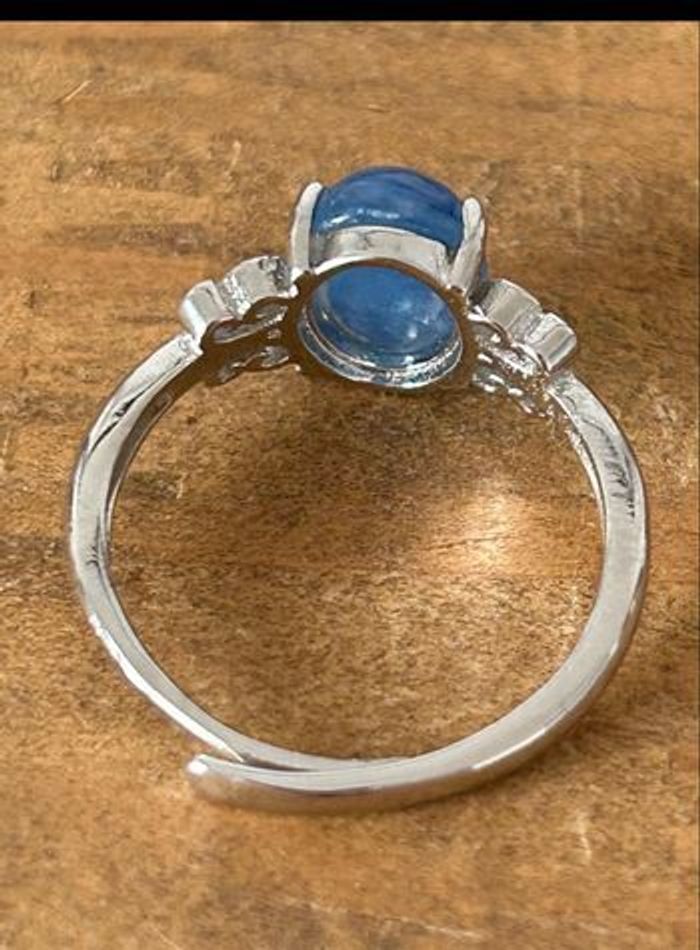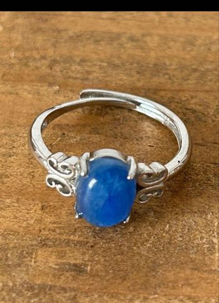 Cette bague met à l’honneur une cyanite naturelle, pierre rare connue pour ses reflets bleus intenses et striés, allant du bleu acier au bleu nuit. Chaque pierre révèle des jeux de lumière particuliers selon l’angle et la texture.