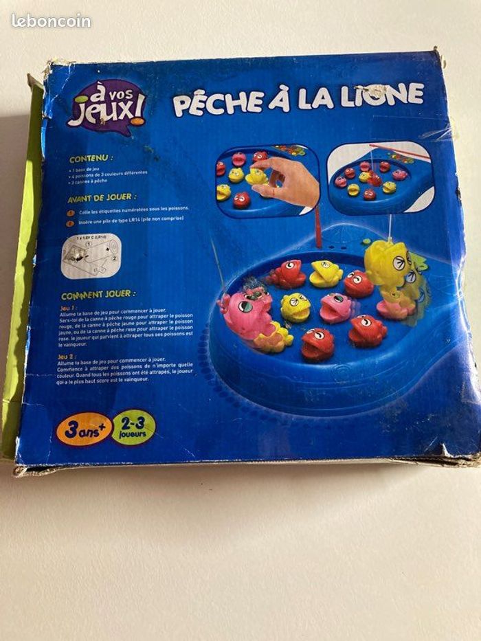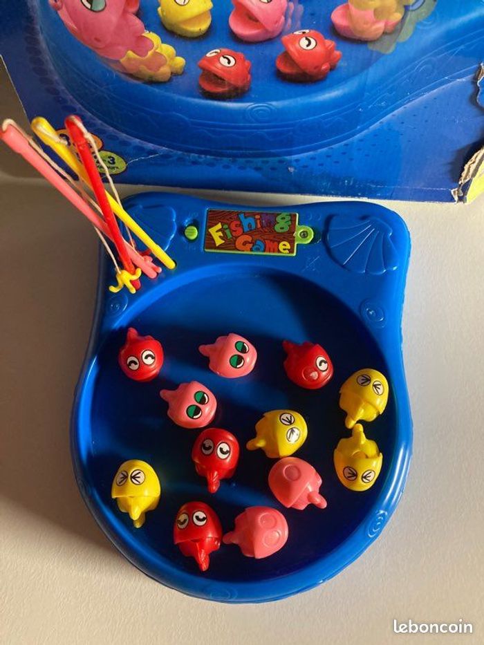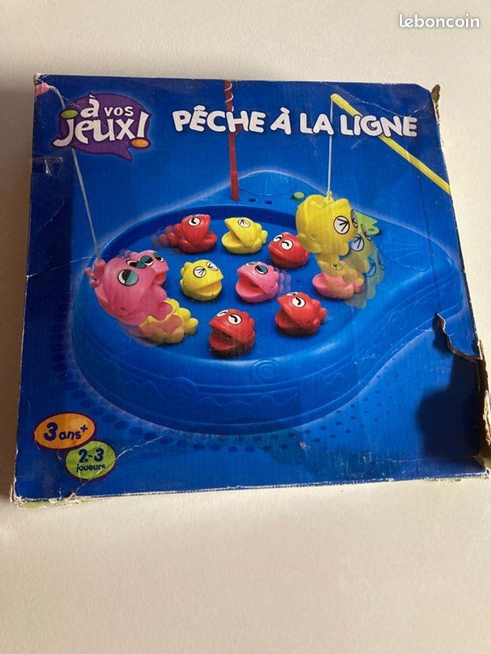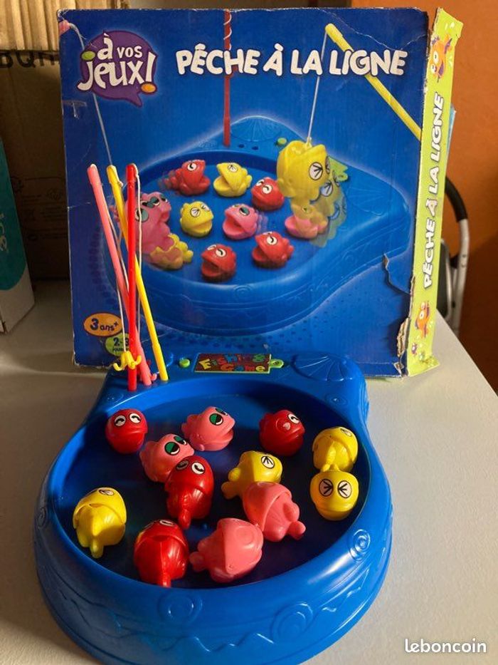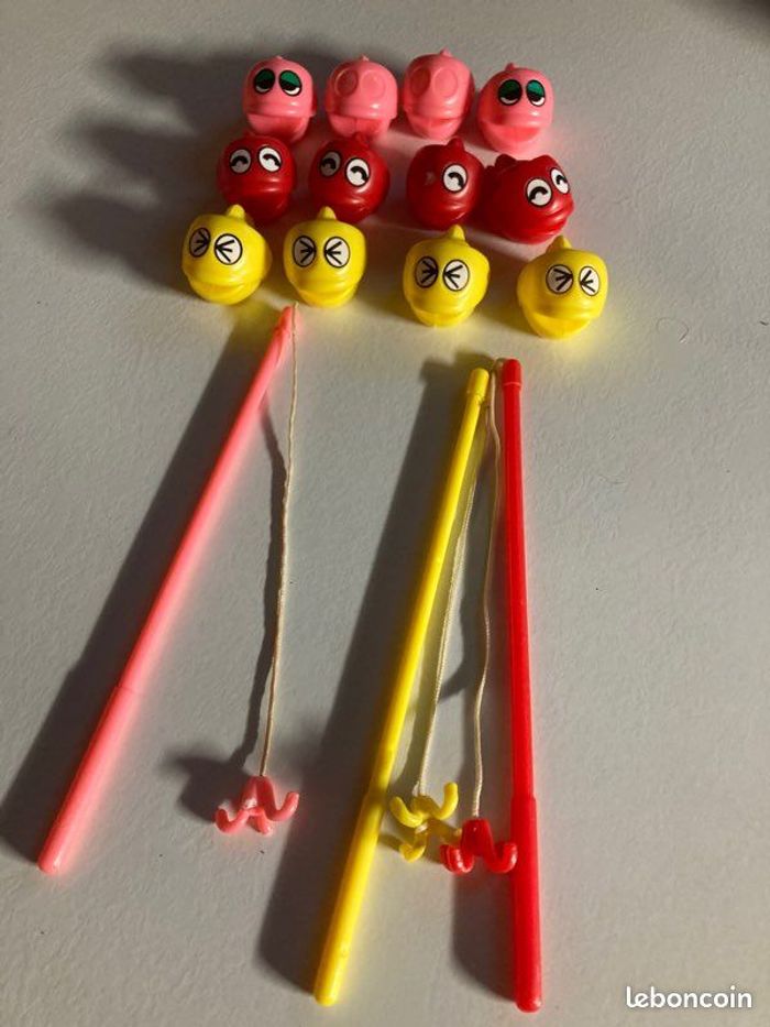 3 cannes à pêche, 12 poissons de 3 couleurs différentes
