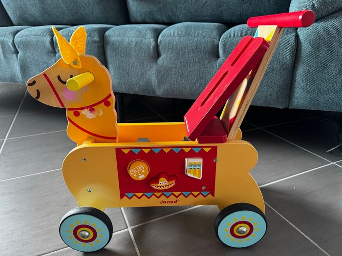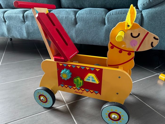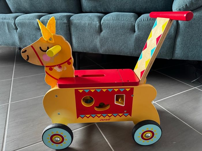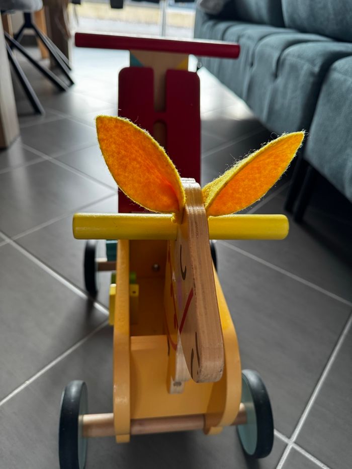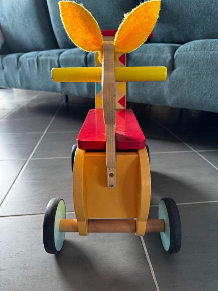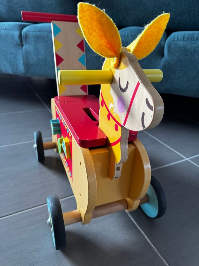 Qui veut faire une petite balade à dos d’âne ? Voici un joli porteur qui deviendra le compagnon idéal, à chevaucher ou à pousser, pour aider votre enfant à gérer ses appuis tout en lui permettant de découvrir le monde qui l’entoure. Votre enfant pourra également tester sa dextérité grâce à la boite à forme incluse dans le corps du porteur. Enfin, avec ses 4 roues silencieuses en caoutchouc, ce porteur ne marque pas le sol et assure un bon maintien en toute sécurité. Développe la motricité fine et l’apprentissage de la marche de l’enfant.