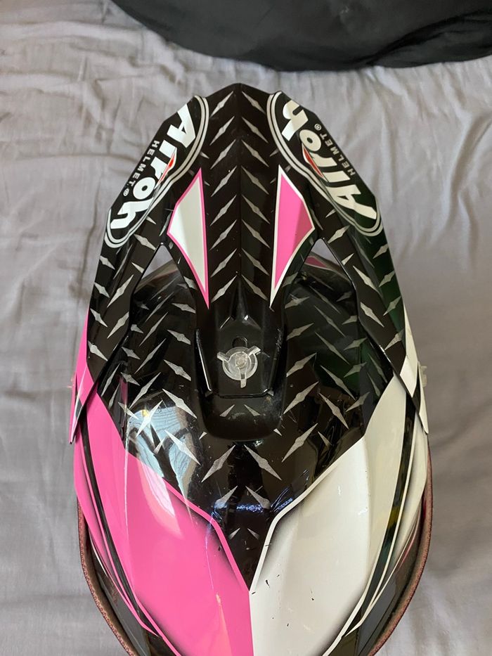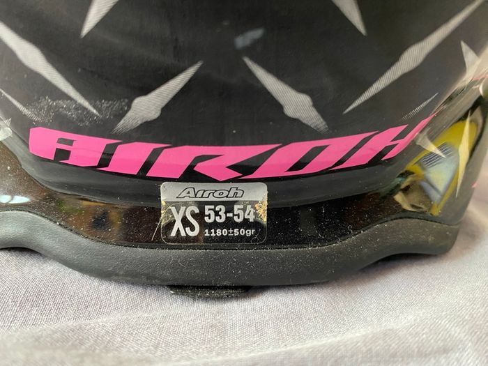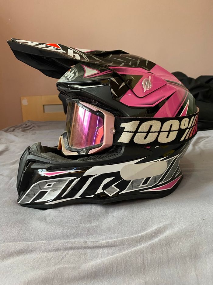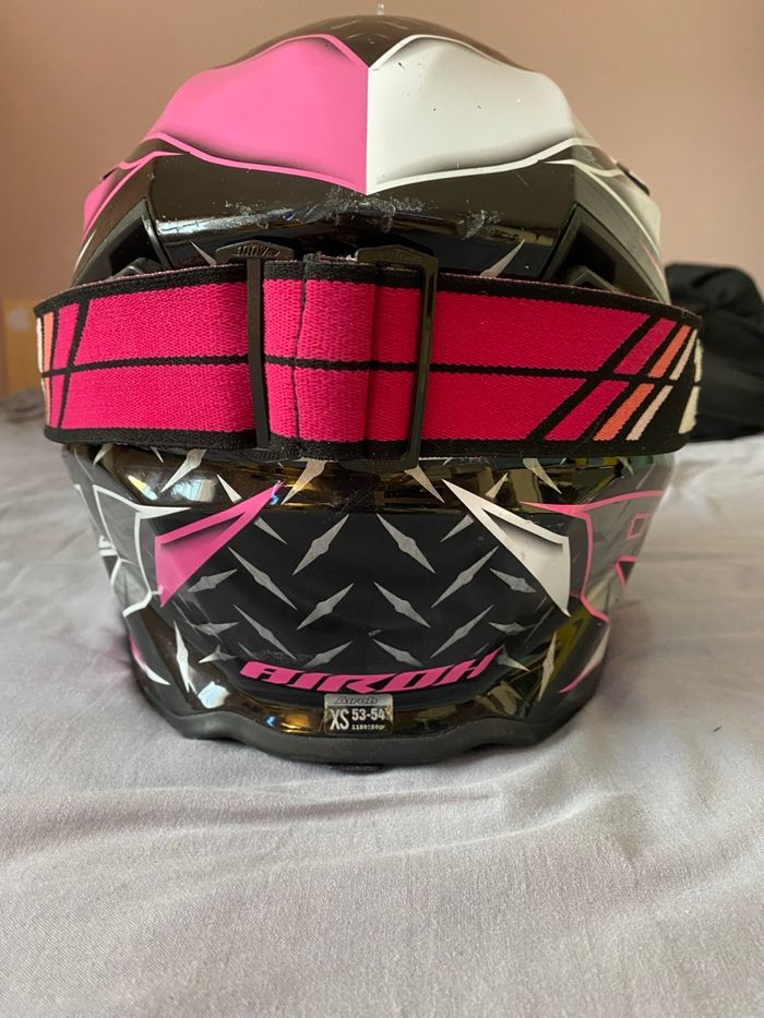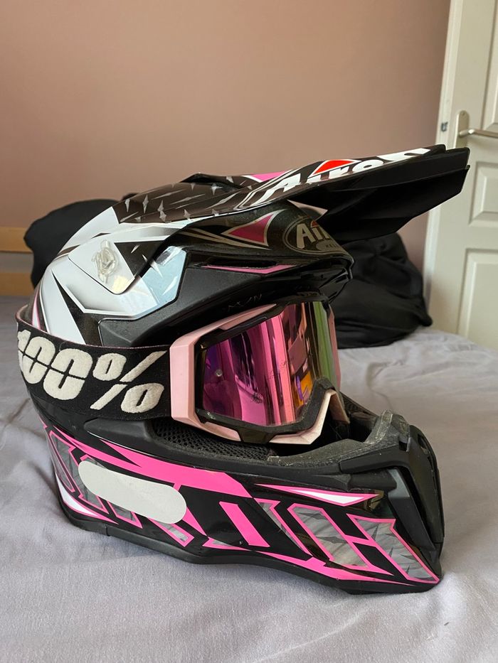 Casque cross Airoh taille XS (53–54 cm), coloris noir / blanc / rose, vendu avec son masque 100% rose miroir. Ensemble en très bon état général, jamais chuté. Ventilation efficace, intérieur confortable avec mousses respirantes, visière réglable et fermeture en boucle double-D pour une sécurité optimale.