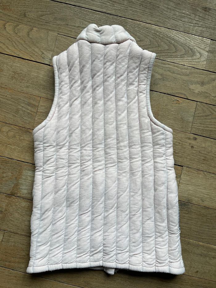 Veste sans manche rose clair, intérieur mille raies marine. Vraiment super pratique à la mi-saison, ou sous un manteau en hiver pour les très froides journées. Ce n'est pas pour rien que les anglo-saxons l'appelle "body warmer "(chauffeur de corps) ! Portée, très bon état général, quelques petites bouloches.