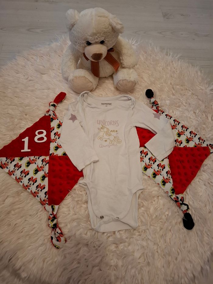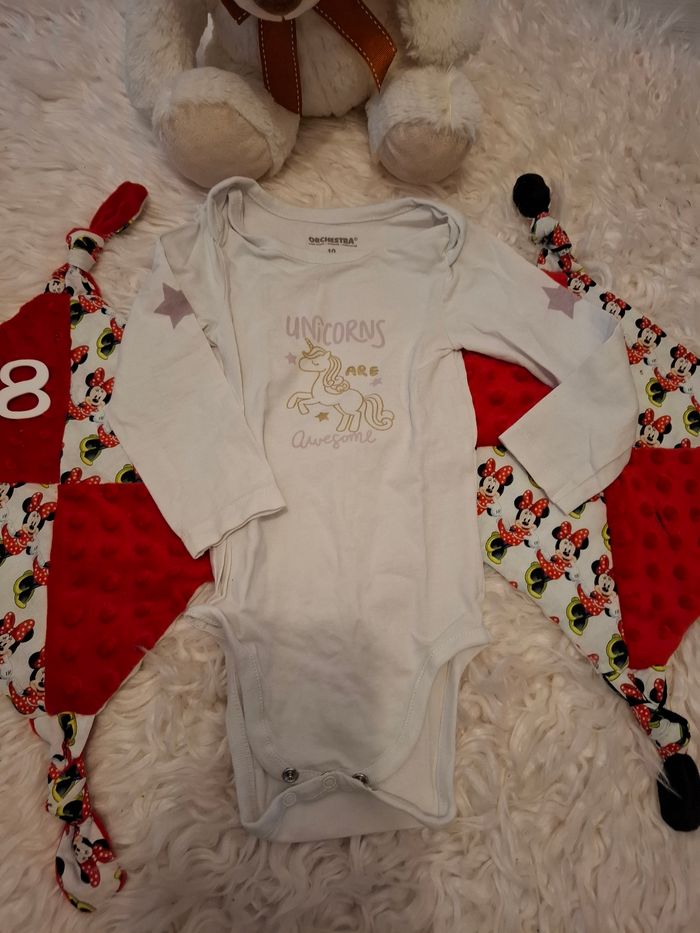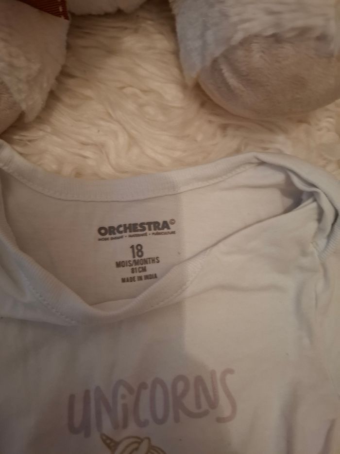 Un bodie avec sa petite licorne Blanc Taille 18 mois Marque Orchestra Très bon état