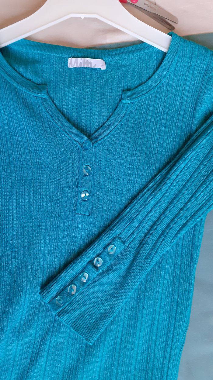 Vends un pull fin manches 3/4, 75 % viscose, 25 % polyamide, col en V avec petits boutons ainsi qu'aux manches, couleur vert, marque Mim, taille 1 34-36. Longueur de l'épaule à la base : 56 cm Largeur aisselle à aisselle : 35 cm.