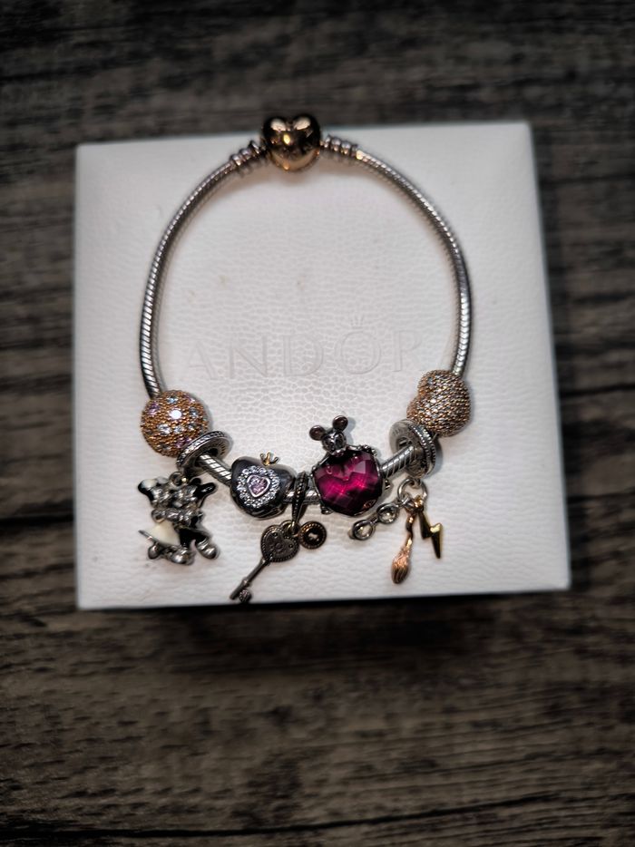 Le bracelet est argenté avec sa fermeture en clip de cœur. Le bracelet Pandora avec tout c'est charms réuni sont juste incroyablement magnifique ! 🤩 Je ne le porte pas (juste porté une seule fois) autant le vendre 🥰☺️
