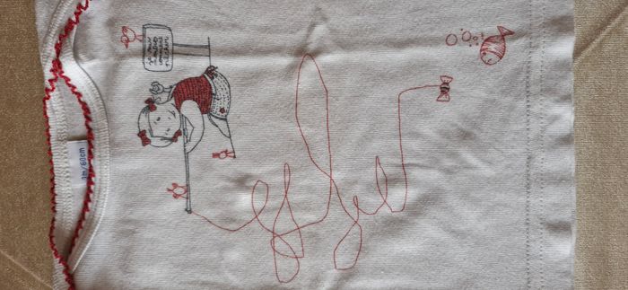 🐭 Motif : Illustration poétique représentant une fillette tenant une canne à pêche, avec un fil rouge menant à un petit poisson