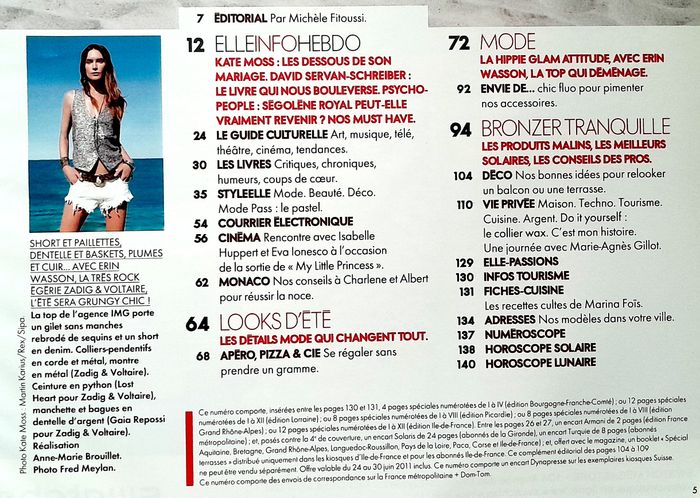 spécial kate moss et jamie hince 4 pages, arizona muse 1 page, eva lonesco isabelle huppert 4 pages, charlène 2 pages, détails mode qui changent tout 4 pages, mode summer of rock, beauté été 8 pages, déco 6 pages, marie agnès gillot 1 page, mary higgins clark 2 pages...