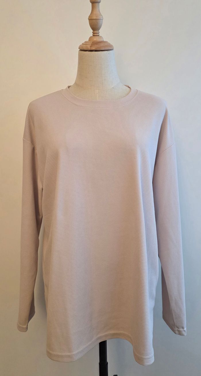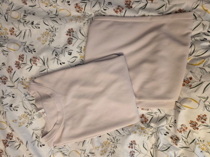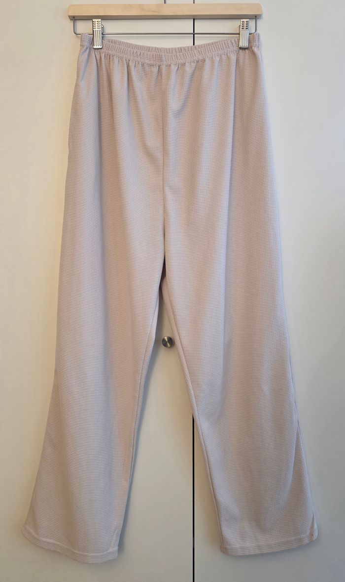 Pyjama taille L, 100% polyester. Couleur crème, haut manches longues.