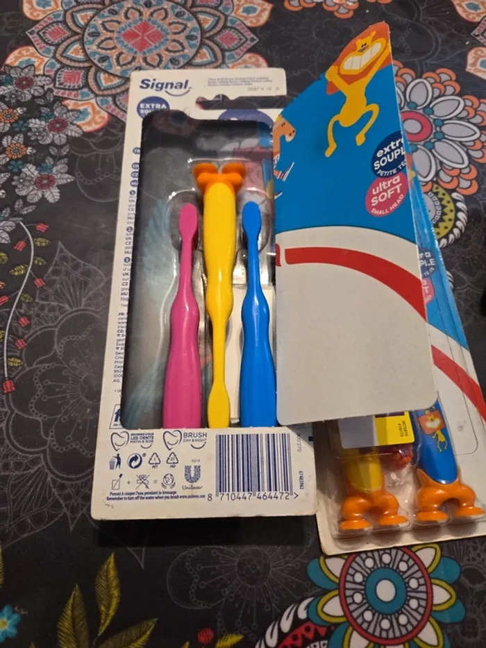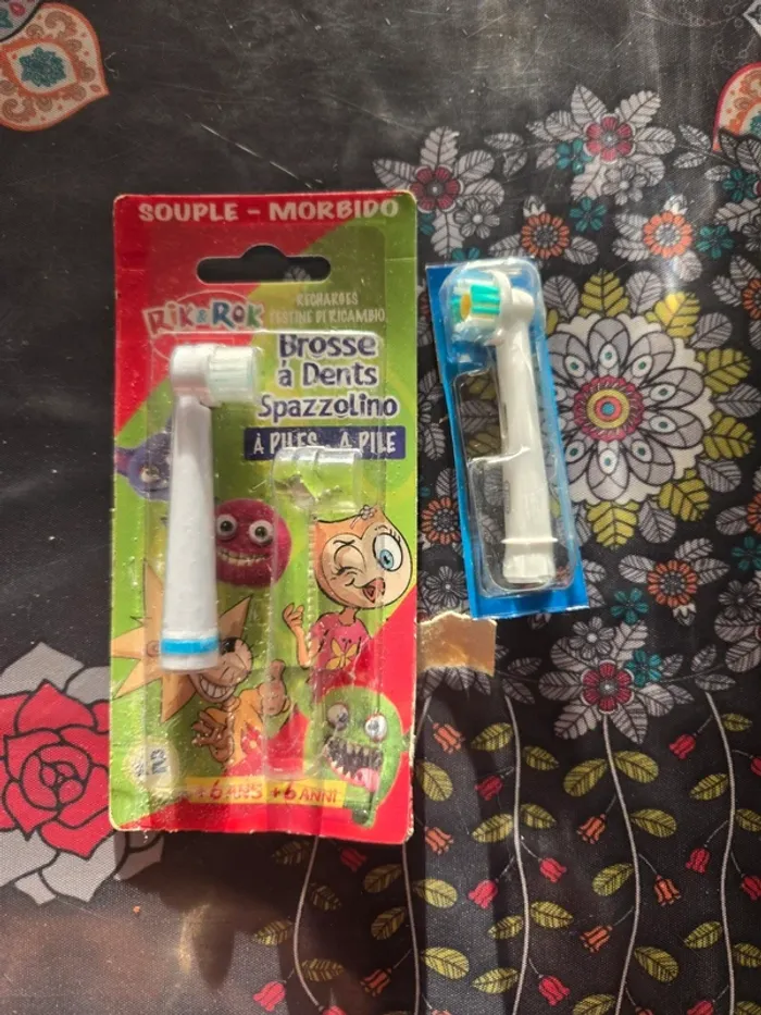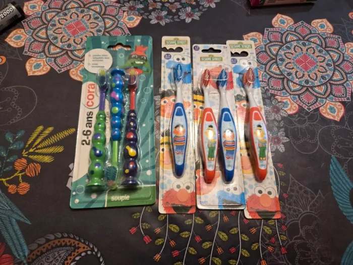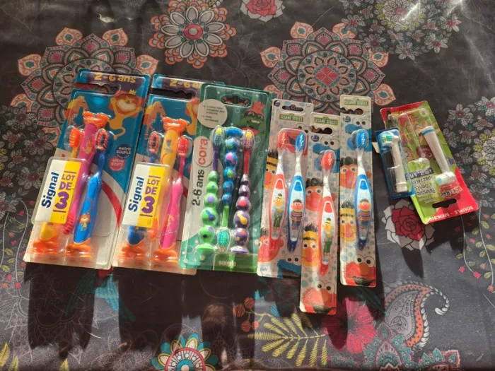 Lot de brosses a dents neuve pour enfant 2-6 ans et 2-7 ans Et 2 embouts brosse a dent électrique enfant Il a en y en a 13 dans tous le lot et 2 embouts Certains emballages sont ouvert mais les brosses sont neuves ⚠️ Les envois se font uniquement via mondial relais, shop2shop by chronopost, relais colis ou colissimo N'hésitez pas a me contacter pour plus d'infos supplémentaires Merci