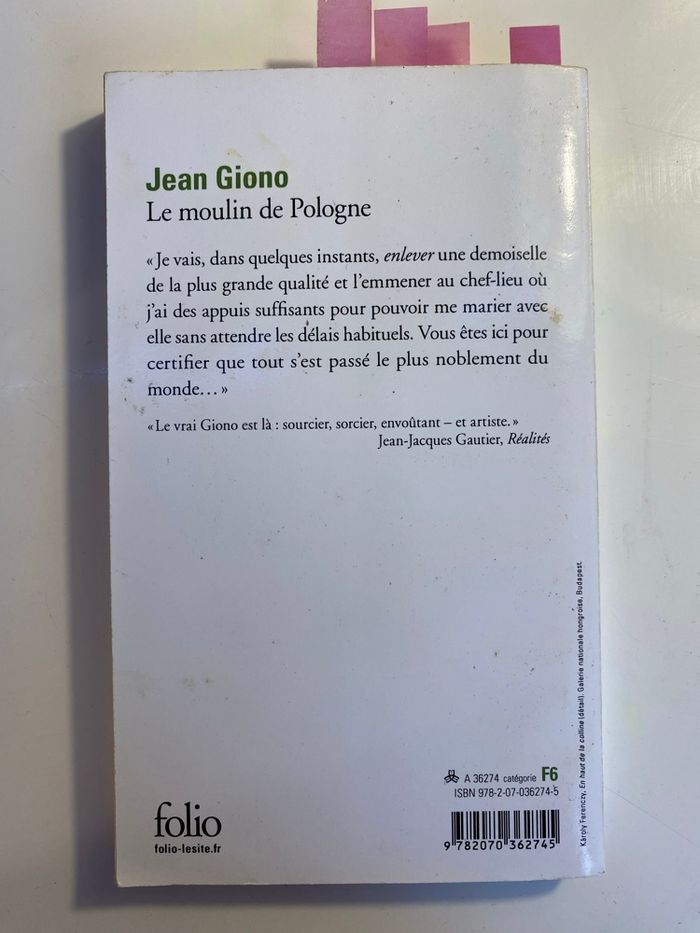 📚Roman puissant et envoûtant de Jean Giono, Le moulin de Pologne explore les thèmes du destin, de la fatalité et de la rumeur à travers l’histoire d’une famille frappée par une malédiction inexorable, dans une Provence sombre et intemporelle. L’écriture dense et poétique de Giono, mêlant lyrisme et tension tragique, offre une lecture marquante et profonde. Édition de poche Folio, pratique et agréable à lire. Livre en état très correct, pages intactes. 📖