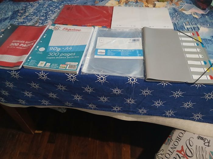 Lot de feuilles grand carreaux simple(200 pages) et (doubles (300 pages).intercalaire, 20 pochette transparentes ,chemise avec a l intérieur des intercalaires. Et feuilles petits carreaux 200 .tot est neuf encore dans leur emballage. Plusieurs marques.