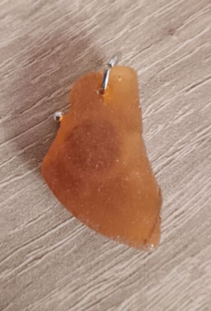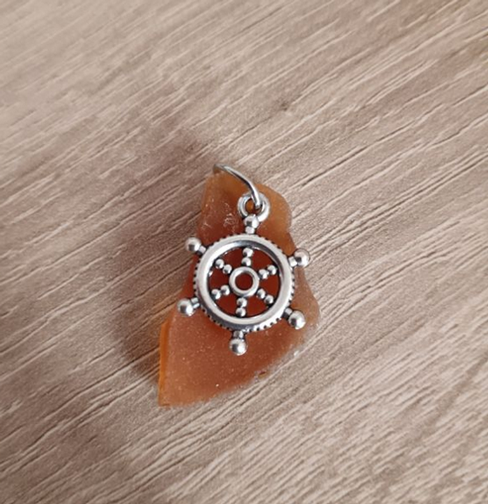 Pendentif fabriqué avec un morceau de verre poli et un breloque en forme de roue Hauteur 3cm Longueur 2cm