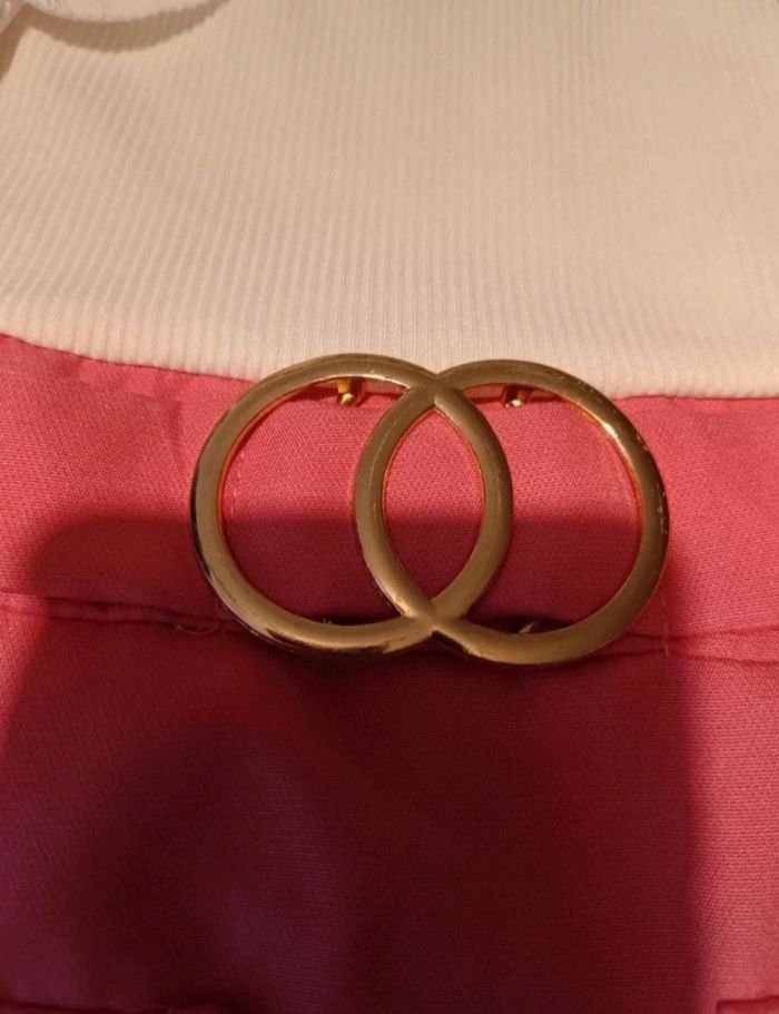 Bas : Jupe rose corail avec ceinture décorative à boucle dorée (anneaux entrelacés) et deux fausses poches ornées de boutons dorés travaillés.