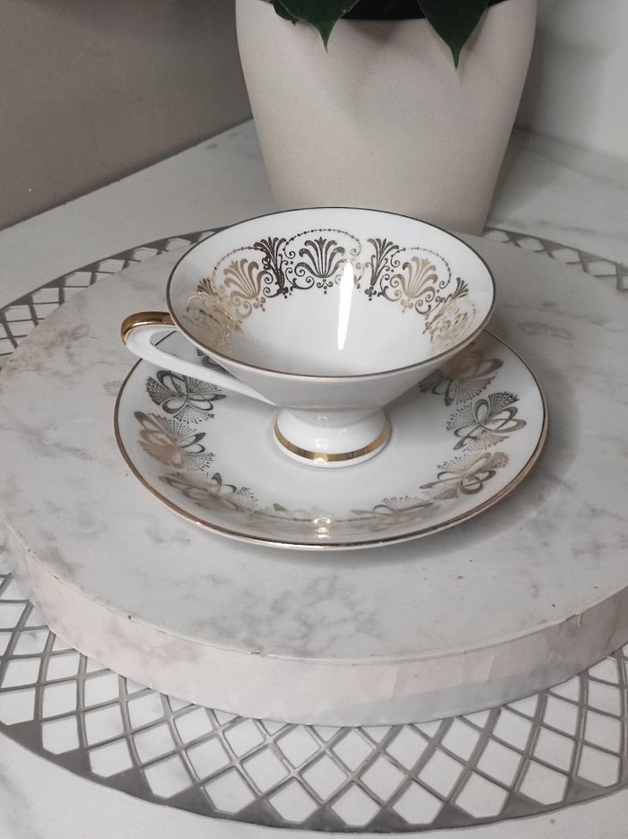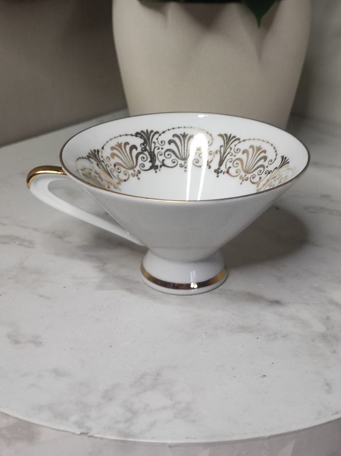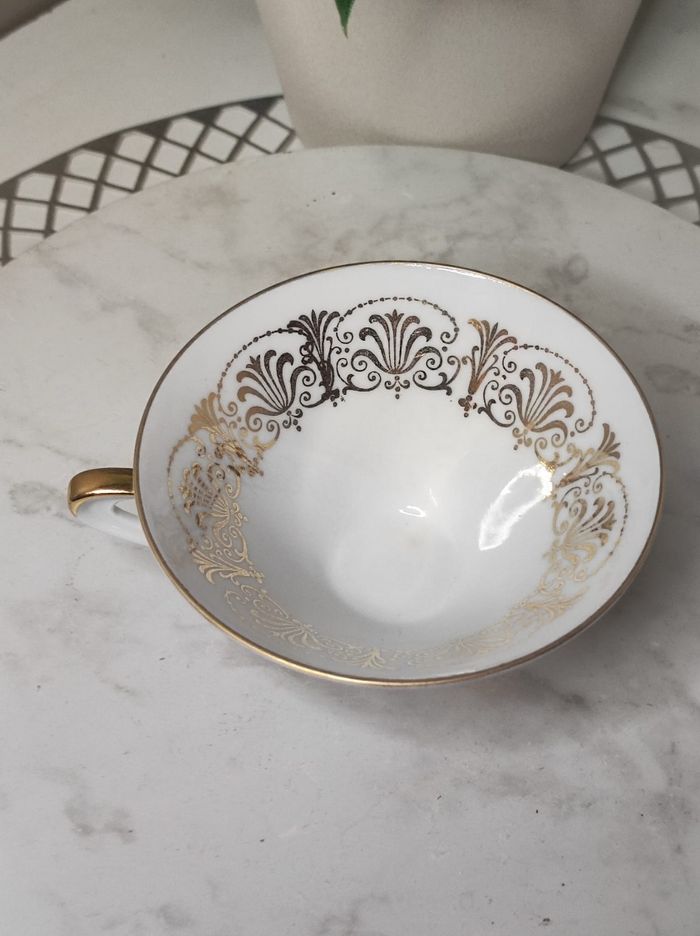 Ensemble dépareillées d'une tasse à thé et sous tasse de porcelaine Bavaria aux motifs dorés.