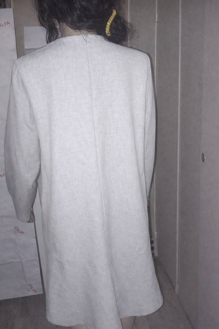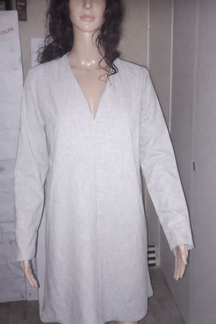 obe femme de couleur grise, au style épuré et moderne. Sa coupe droite et son col en V apportent une allure élégante et intemporelle. Les manches longues ajoutent une touche de sobriété, idéale pour un look chic au quotidien ou professionnel.