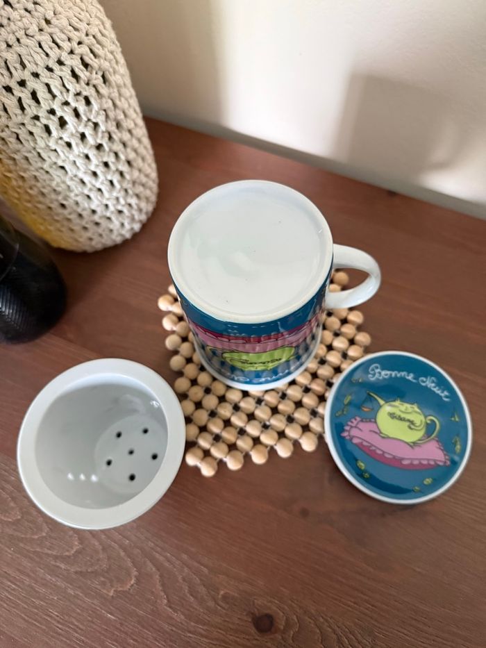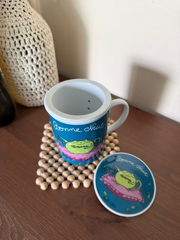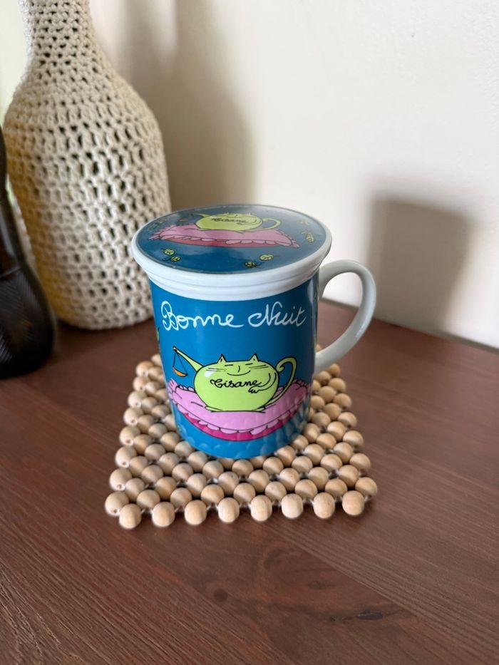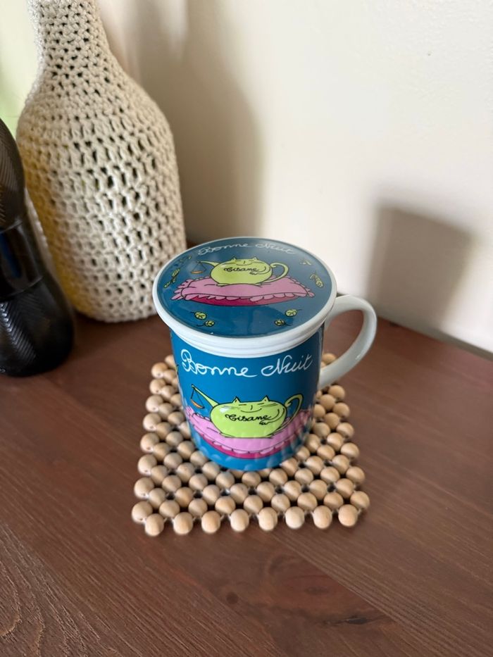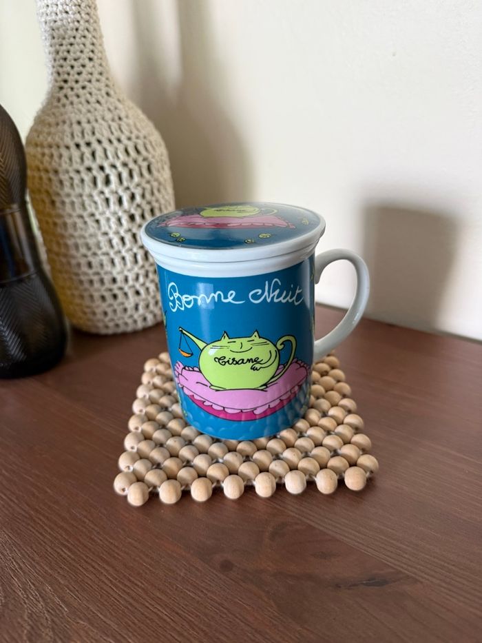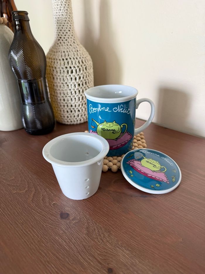 Tasse tisanière avec filtre et couvercle motif chat Avec écriture tisane - bonne nuit Fox trot
