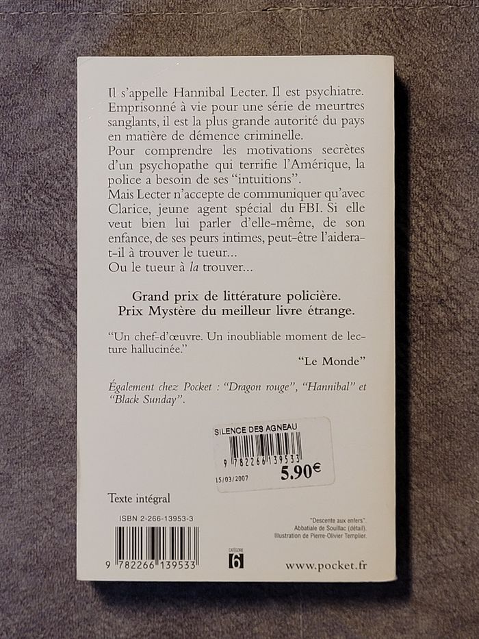 Bonjour, Je vends ce livre nommé - Le Silence des agneaux Thomas Harris - en bon état. Si vous rechercher un livre ou un acteur en particulier et pour gagner du temps, n'hésitez pas à me le demander, je vous répondrais dès que possible 😇 Veuillez vous abonner pour recevoir toutes les nouveautés Pour autres infos n'hésitez pas à me contacter. ***** Merci de votre visite *****