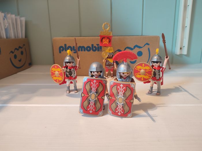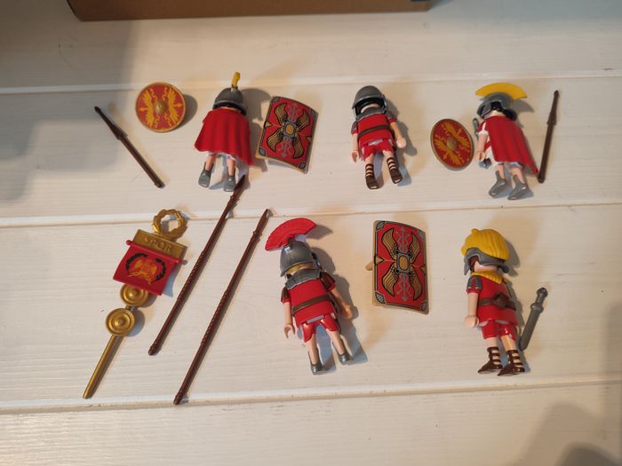 Set composé de 5 soldats Romains : 2 légionnaires 2 javelines 1 porte étendard Chaque personnage est équipé d'un glaive (5), d'un casque (5), 2 lances et 2 javelins, 4 ceinturons, 1 support d'arme arrière (porte étendard), 4 boucliers envoi rapide et soigné