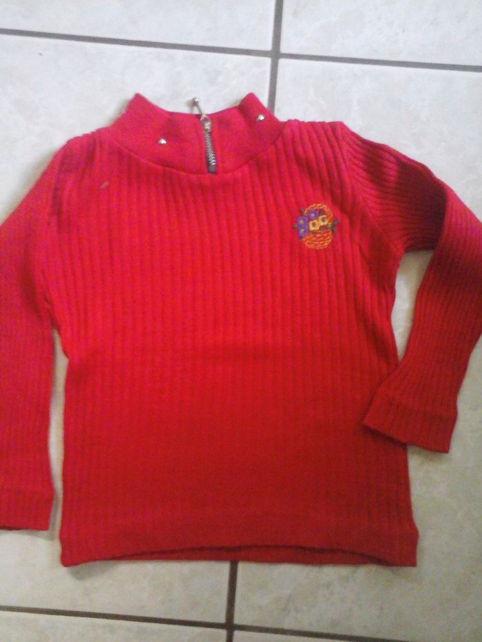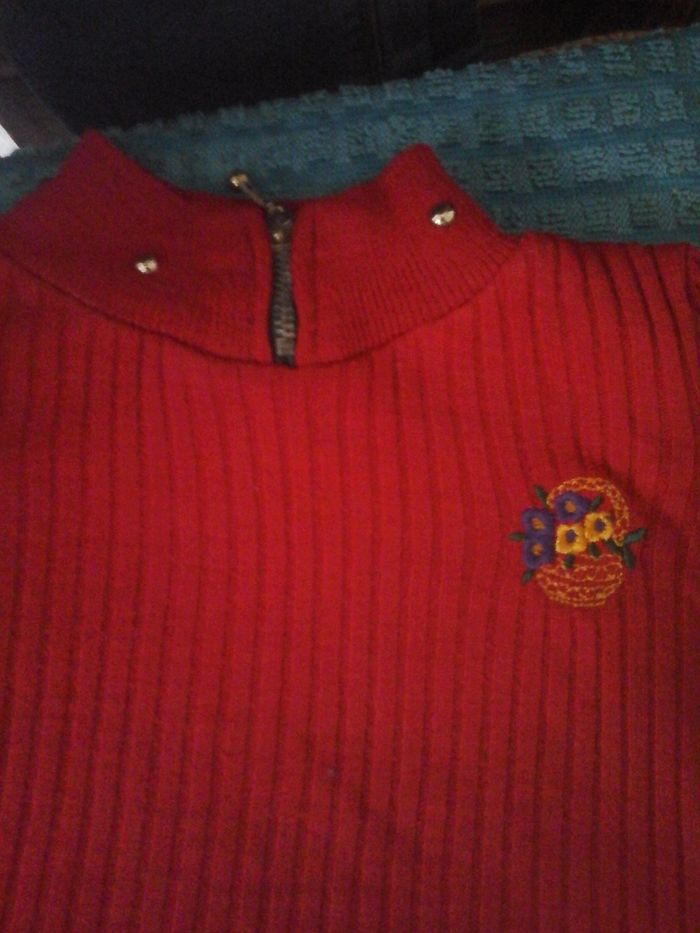 Pull côtelé rouge 2/3A- Manches longues- Fermeture Éclair col orné de 6 clous- Broderie panier fleurs devant- coton. TBE