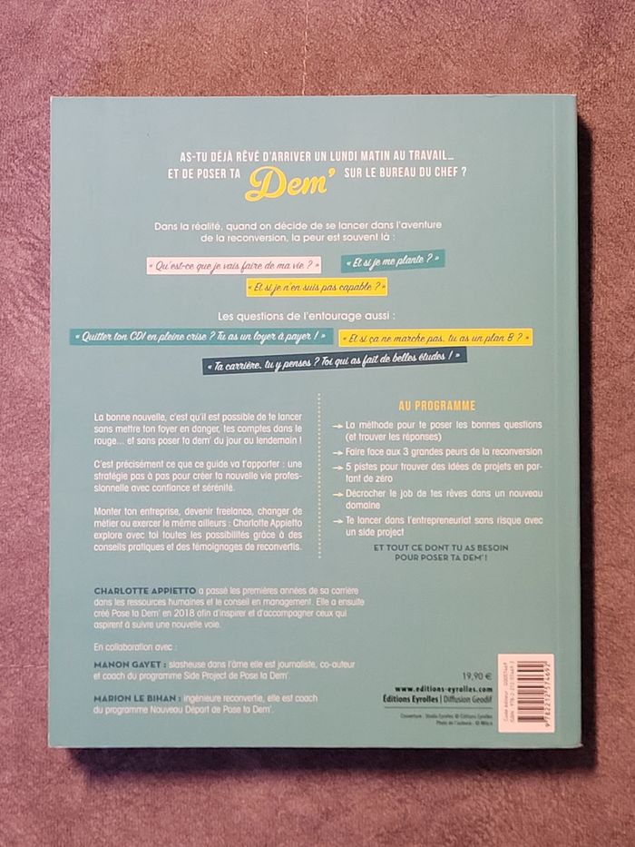 Bonjour, Je vends ce livre nommé - Pose ta dem' - L'art de réinventer sa vie professionnelle Charlotte Appietto - en très bon état. Si vous rechercher un livre ou un acteur en particulier et pour gagner du temps, n'hésitez pas à me le demander, je vous répondrais dès que possible 😇 Veuillez vous abonner pour recevoir toutes les nouveautés Pour autres infos n'hésitez pas à me contacter. ***** Merci de votre visite *****