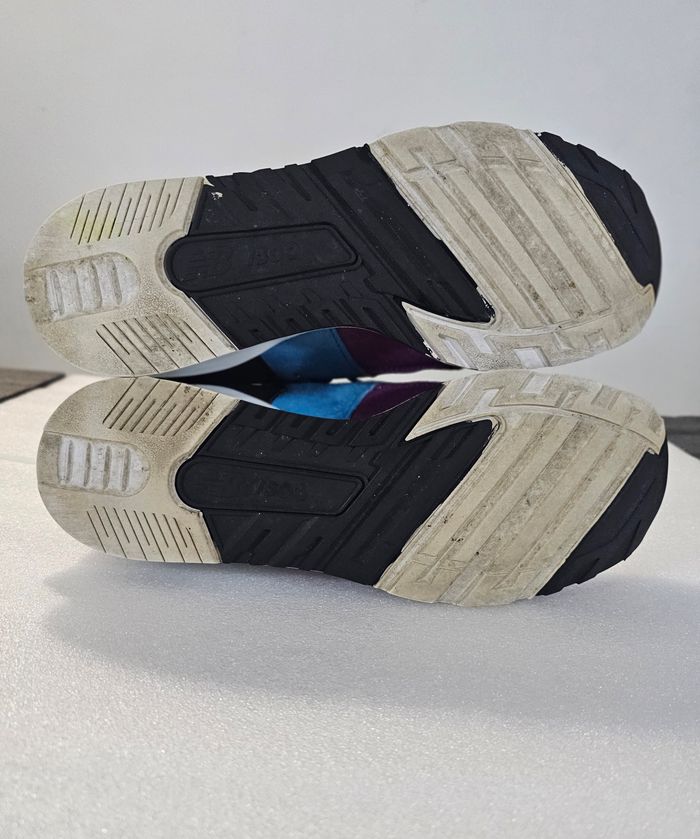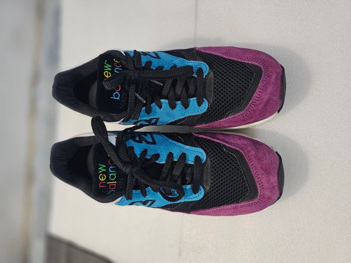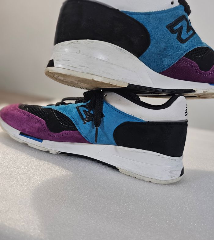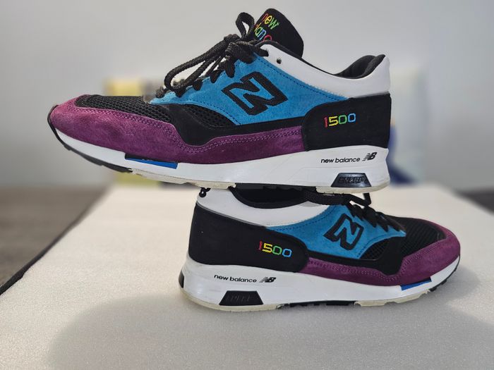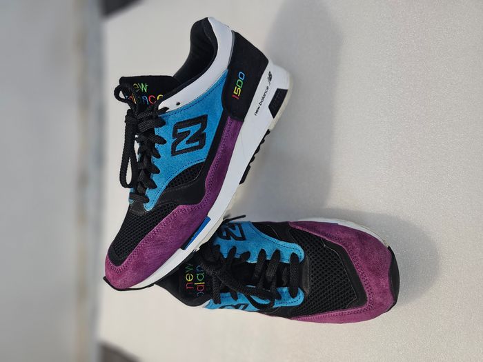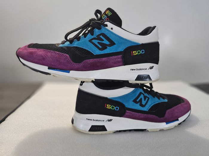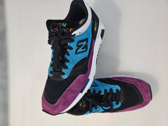 Sneakers iconiques New Balance 1500, fabrication Made in England, reconnues pour leur confort et leur qualité premium. Coloris original et recherché (violet, bleu, noir, détails multicolores). Vendu sans boîte ✔️ Modèle authentique (étiquette intérieure visible sur les photos) ✔️ Daim et mesh de qualité ✔️ Confort ENCAP ✔️ Lacets noirs ✔️ Taille EUR 43 (UK 9 / US 9.5) ℹ️ À noter en toute transparence : La semelle intérieure a été changée (voir photo de l’intérieur des chaussures). Taille : 43 EU