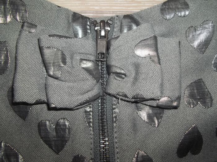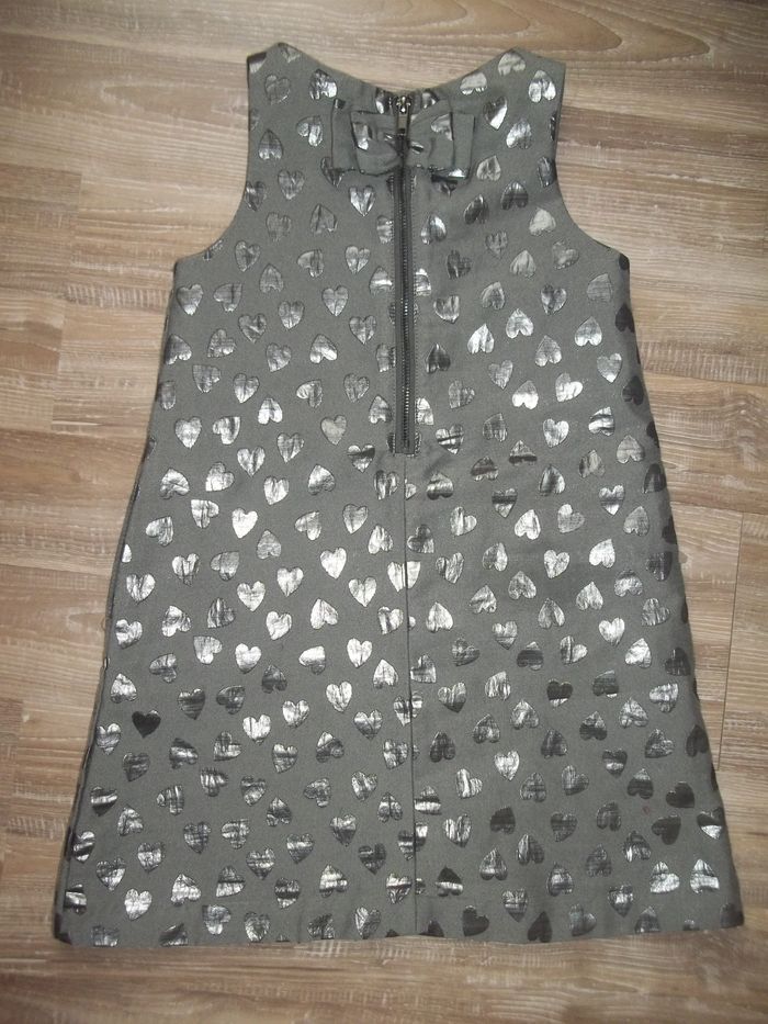 Robe sans manche, col rond, forme un peu trapéze, en tissu bi-matière tissé coeurs argentés (89 % polyester 11 % fibre métallisée) doublée 100 % polyester. Gros noeud cousu haut du dos. Fermée dans dos (fermeture éclair de 26 cm), 2 poches discrètes dans couture côtés. Longueur 65 cm, largeur aisselles 33 cm. Plus l'étiquette de taille mais à priori du 6 ans.