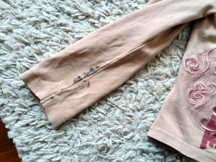 Tissu de qualité extensible Fronces aux épaules Motif fée et lettres brodées Tâche sur une manche mais sur le côté intérieur donc facilement cachée quand l'article est porté, et très bon état général du tee shirt
