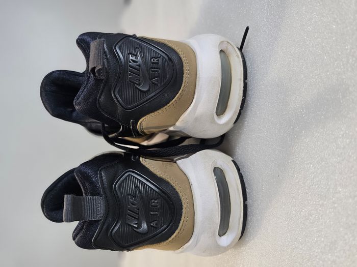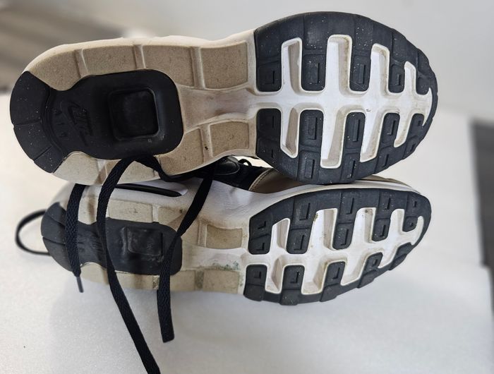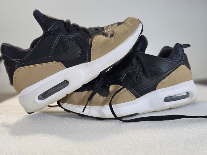 Baskets Nike Air Max Prime, modèle confortable avec unité Air visible, idéal pour un usage quotidien. Coloris noir avec empiècements beige et semelle blanche. Vendu sans boîte ✔️ Modèle authentique (étiquette intérieure visible sur les photos) ✔️ Tige en cuir et textile ✔️ Amorti Air Max ✔️ Lacets noirs ✔️ Tirant arrière ✔️ Semelles extérieures encore fonctionnelles Taille : 42,5 EU (US 9 / UK 8 / 27 cm)
