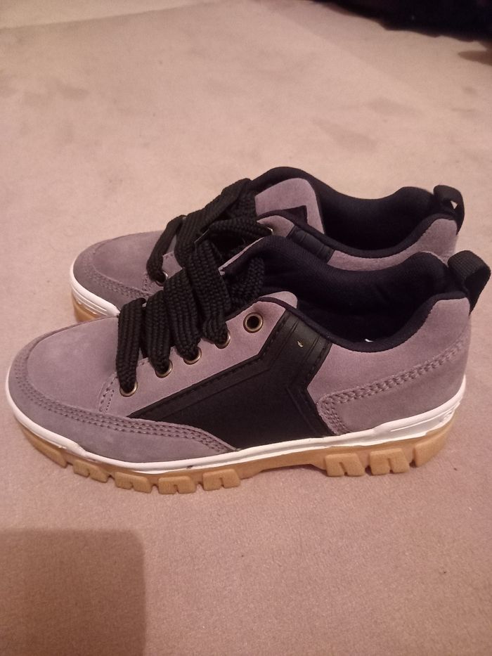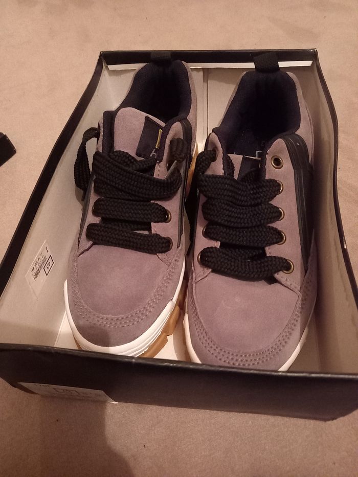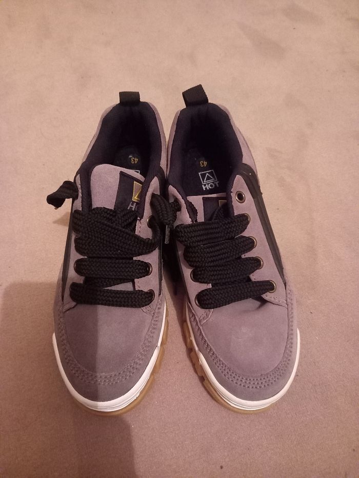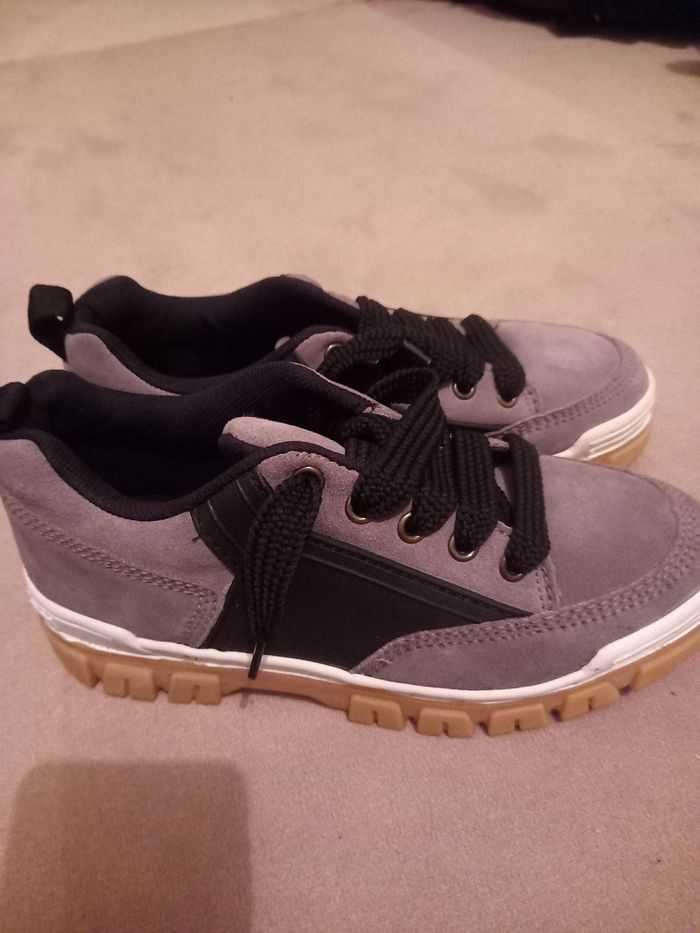 Chaussures neuves t.43 grises et noires, jolis larges lacets noirs
