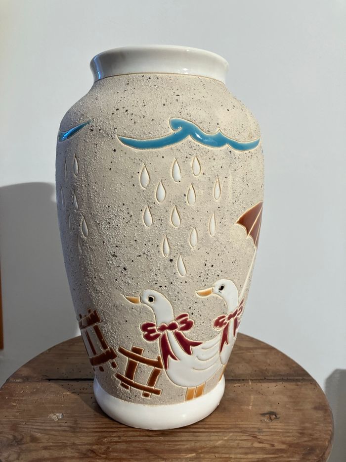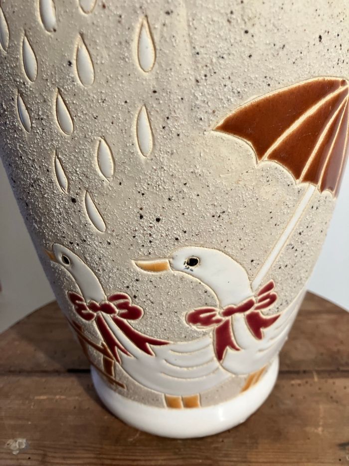 Il présente un décor en relief avec des oies sous la pluie, nuages et parapluie, Tons bleu ciel, marron, jaune, beige typiques du design nordique. Texture sableuse, avec des émaux mats et brillants