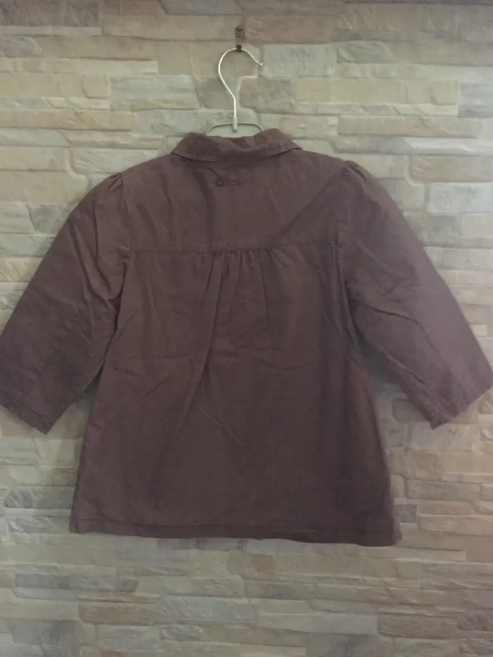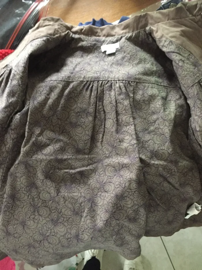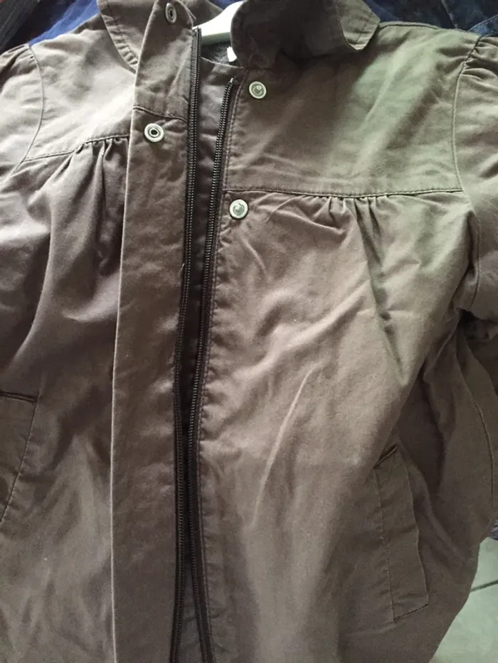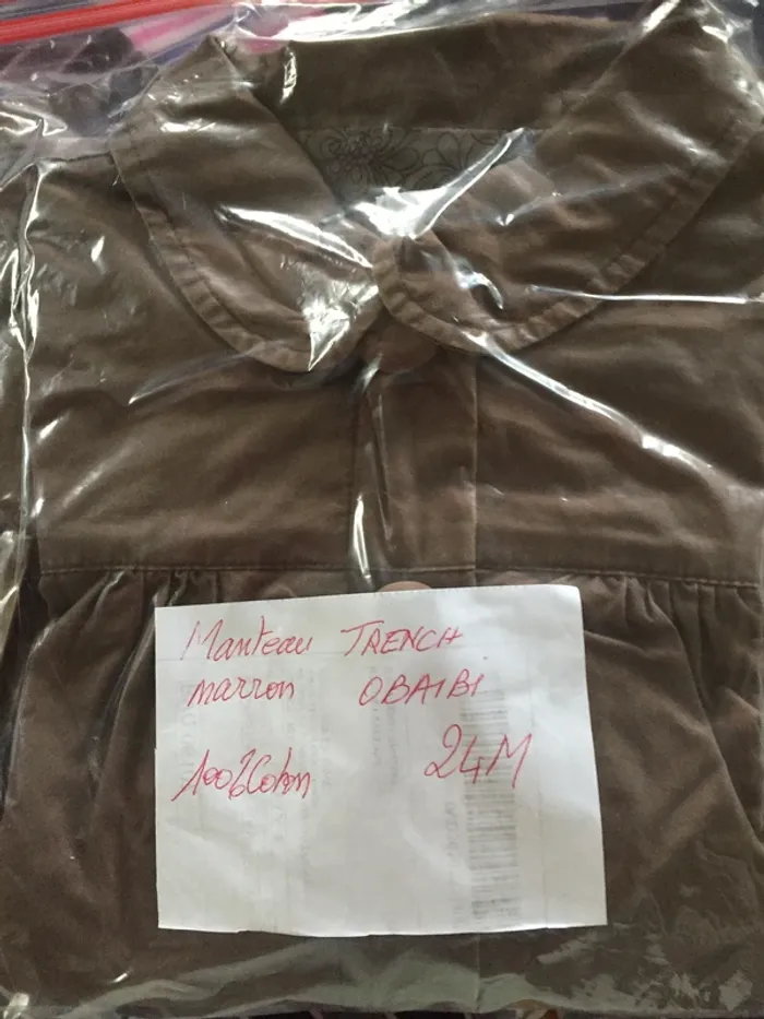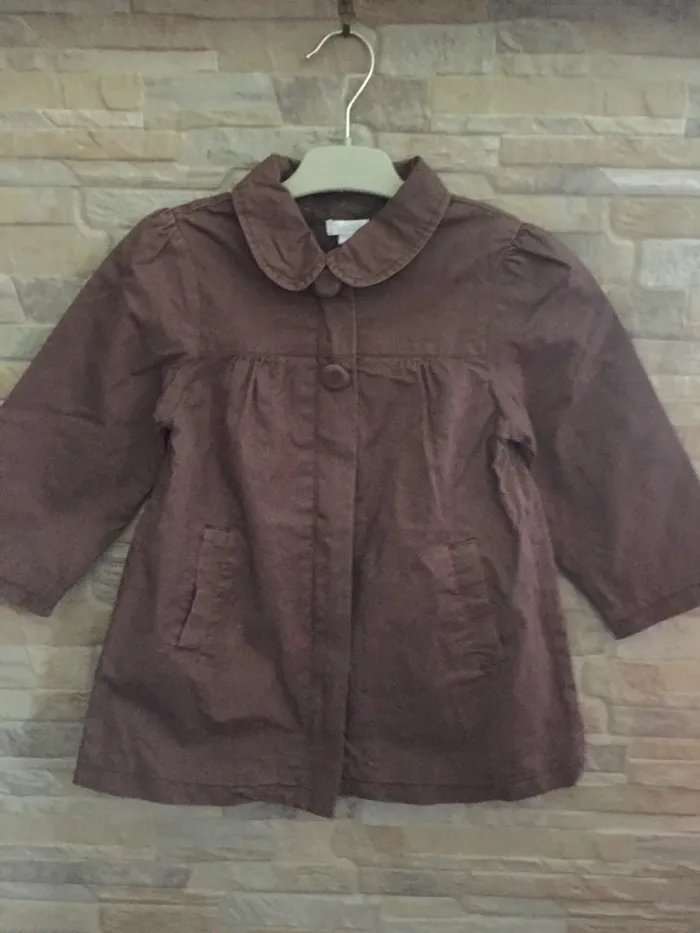 Manteau gabardine Obaibi marron 24M, fermeture Éclair + 2 gros boutons en tissu avec pressions, plissé au dos, entièrement doublé, 100% coton - (tout petit accroc photo 8) - TBE