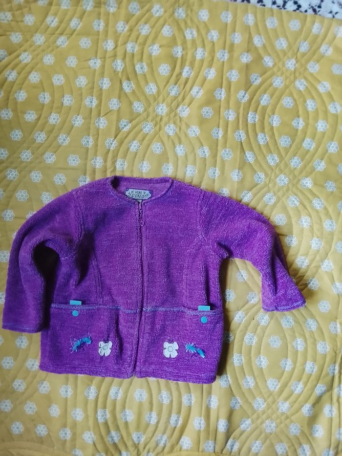 Bonjour, très belle veste a offrir pour Noël de la marque mini stereo en parme avec deux poches devant a manches longues et fermer par fermeture éclair et des fleurs en bas . 75% polyester, 25% acrylique. En très bon état et sans étiquette : hauteur devant : 36cm, Largeur : 28cm. Hauteur manche : 29cm, largeur: 12cm. Pensez à vos cadeaux de fin d'année.