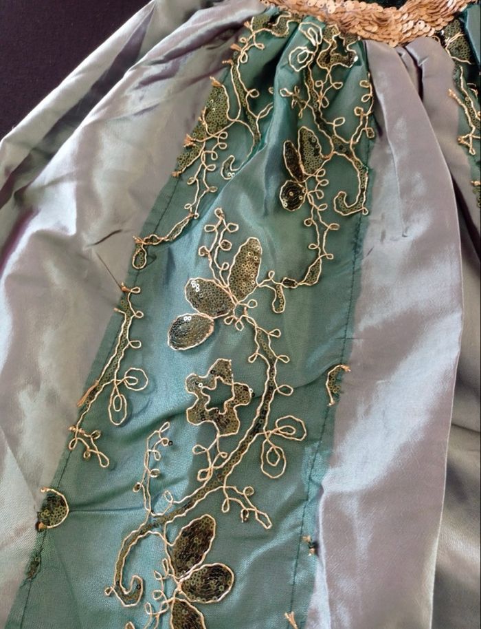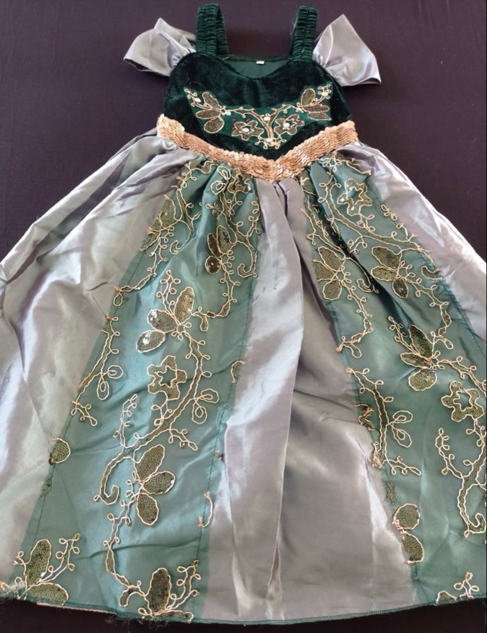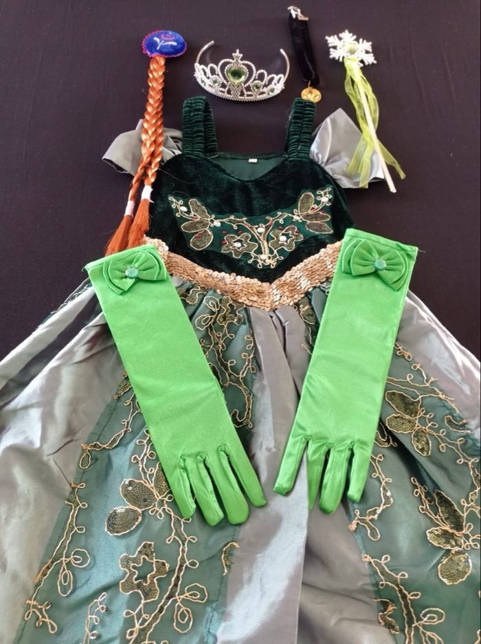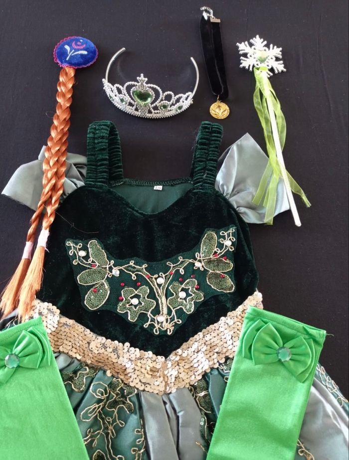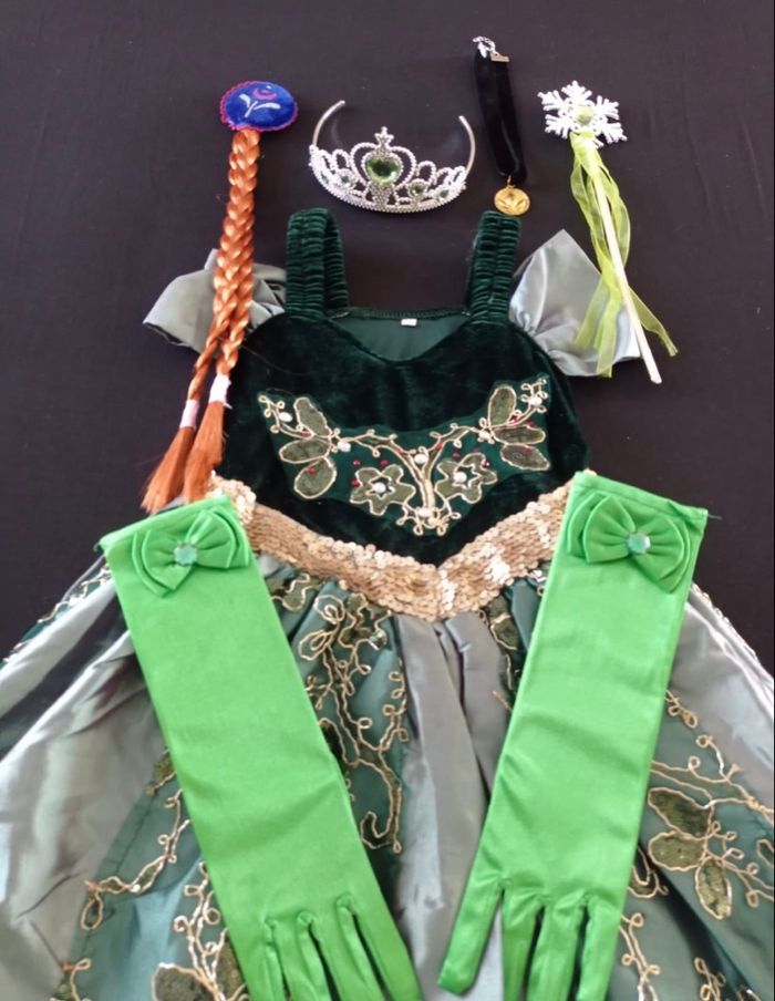 Déguisement robe princesse verte et noire et ces accessoires (couronne, baguette, gants, tresse). La robe mesure 80cm de longueur, la taille convient aux petites filles de 4-5ans. Totalement neuve, vendue dans son emballage d’origine. Expédition rapide après votre commande