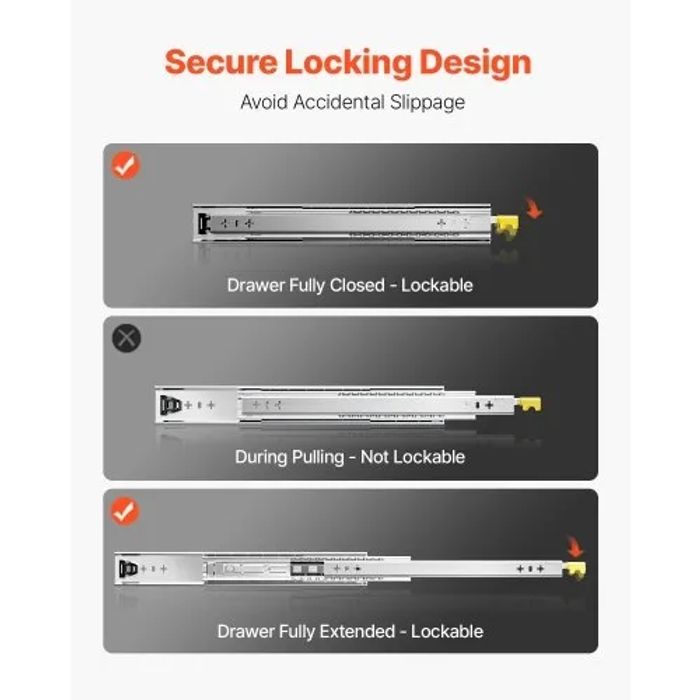 Coulisses à verrouillage fluide et silencieuses : Ces coulisses sont dotées d’un système de verrouillage et d’enclenchement facile à utiliser. Contrairement aux coulisses sans mécanisme de verrouillage ou ne possédant qu’un seul point de verrouillage, notre système de verrouillage sécurisé offre une sécurité et une stabilité accrues. Une double rangée de roulements à billes assure un glissement fluide à l’ouverture et à la fermeture des tiroirs. Le rembourrage en nylon des coulisses centrales est conçu pour réduire le bruit et éviter tout dérapage.